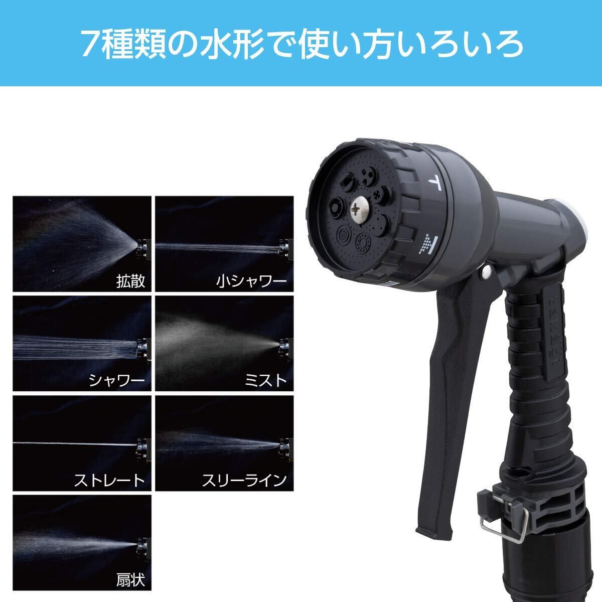 狭い場所での散水や、ベランダでの水やりに便利なハンガータイプのコンパクトリールです。 散水ノズルの水形は7種類です。 横水栓、万能ホーム水栓、自在水栓(蛇口外径14mm~18mm)の 蛇口には付属の蛇口ニップルでそのまま取り付け可能です。