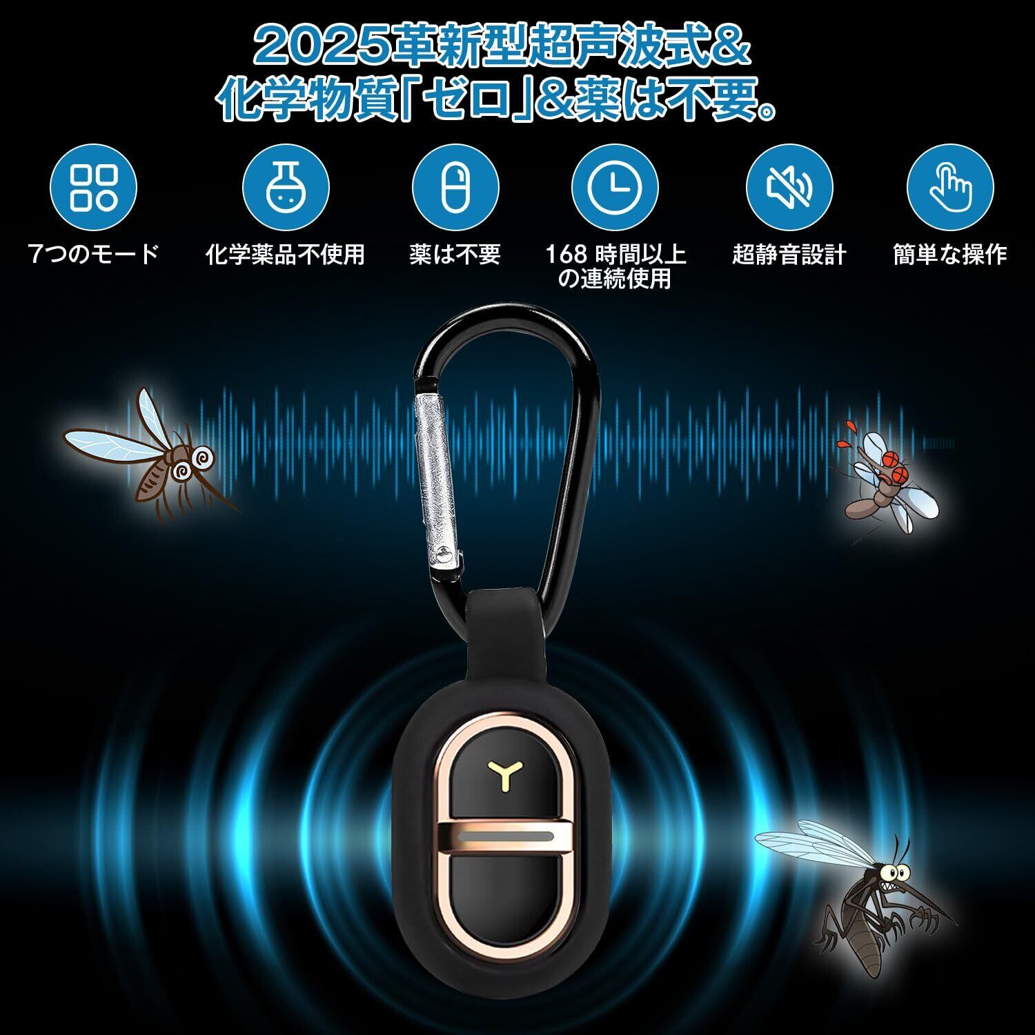 【つけるだけ!虫が嫌がる7種の音】当社の小型虫よけ器は超音波周波数を採用して、360°全方向まで超音波を送信して、蚊などの嫌がる音をまねることで、周波数は25Hz~2.5KHzに達する、蚊は不安のために逃げます。効果範囲は最大約35mで、虫が嫌がる7種の音は、それぞれ異なる色の指示ランプがあります。薬剤不使用で安全、無臭で快適、より効果的。大切な家族、お子様やペットを守る新しい虫よけツール。見えない「音の盾」で虫をガード。