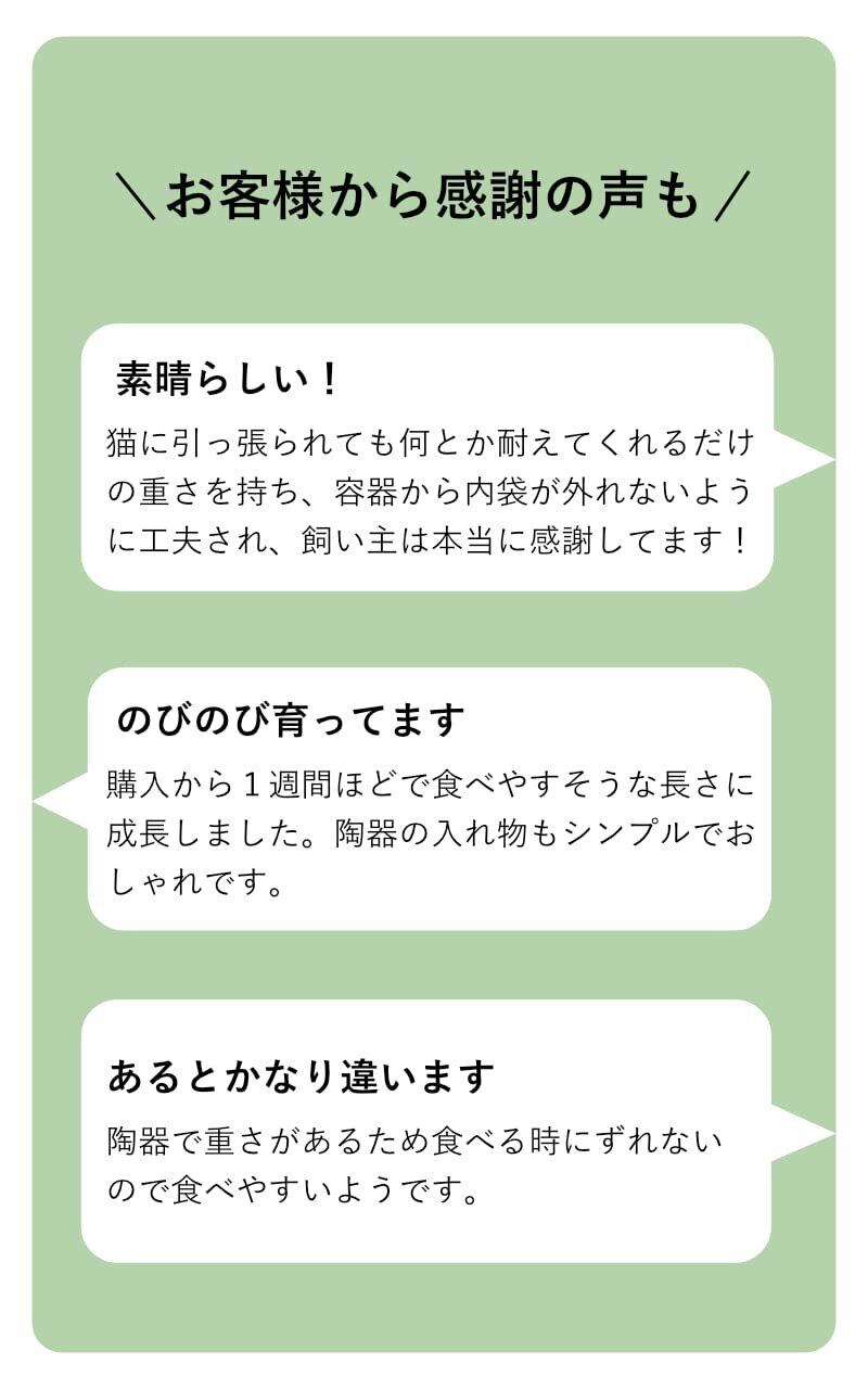 猫にとって大切な猫草を気軽に自宅で栽培できるキット「にゃんベジ」。容器は有田焼を採用し重みを持たせ、倒れにくい形状にしました。リフィルは使用後に可燃ごみとして処理できます。