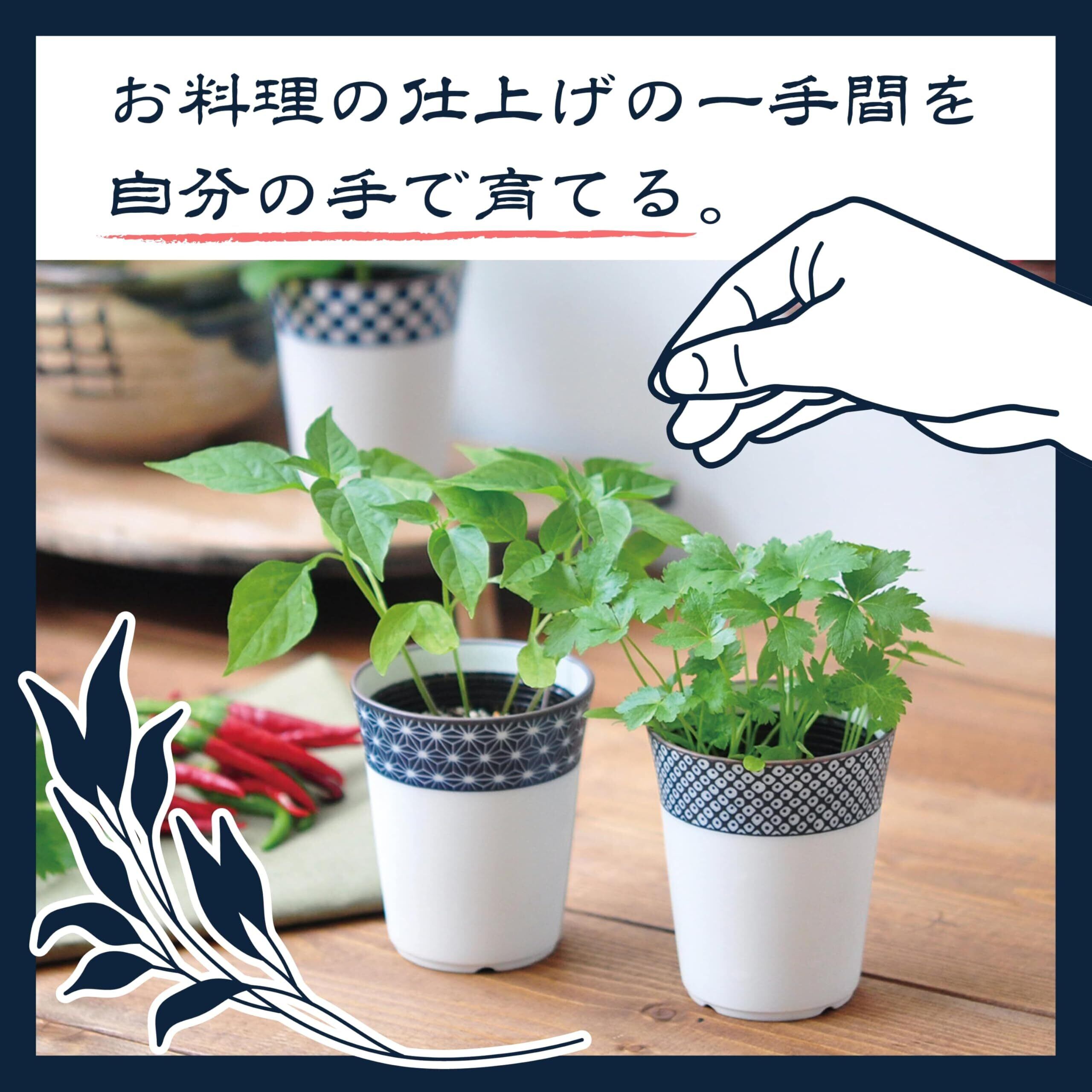 聖新陶芸 通年 家庭菜園 簡単 栽培キット ゆったり育てる シソ 大葉 ハーブ 野菜 栽培セット ( 自由研究 / 食育 ) 鉢の径7cm 染付小紋 薬味小鉢 母の日 プレゼント 誕生日 GDー75801