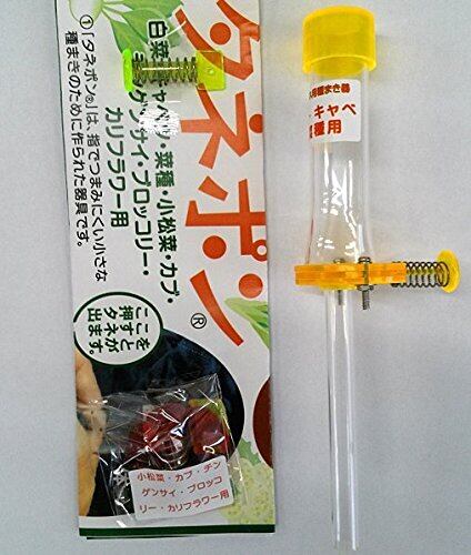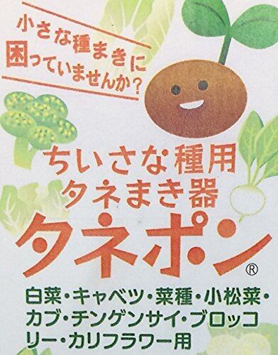 タネポンは指でつまみにくい小さな種まきのために作られた器具です。種の落ちる穴の大きさが約2ミリあります。2ミリより小さくて、1.6ミリぐらいまでの球形の種まき用の器具です。キャベツ、白菜、菜類、小松菜、カブ、チンゲンサイ、ブロッコリー、カリフラワーなどの種まきに利用できます。(ごみやほこりなどは、分解して、取り除いてください。種の形状や大きさなどによっては合わない場合があります。 1粒用、2粒用の部品が入っています。本体のネジをゆるめてしてご使用下さい。
