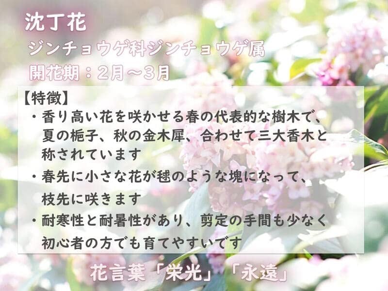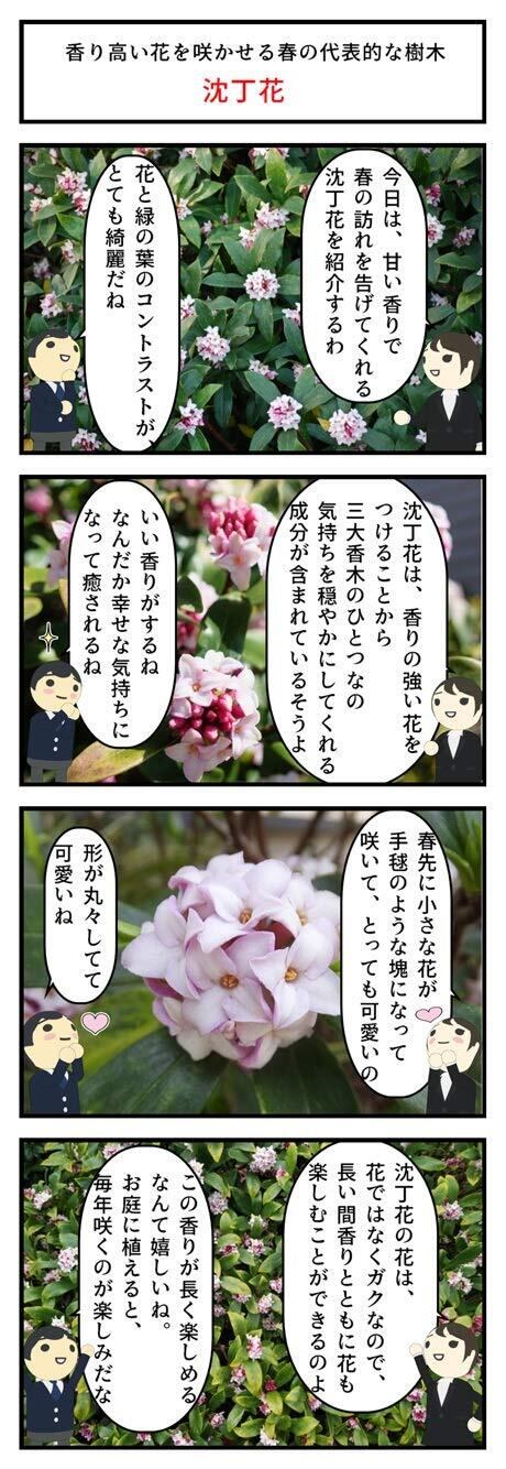 ジンチョウゲのお花はとてもいい香りがします 春の香りといえば 遠くまで漂う芳香力の強さは、沈丁花が あげれるのないでしょうか 三大香木(さんだいこうぼく)とは、香りの強い花をつける3つの樹木のことを言います。以下の3つの樹木が、三大香木 キンモクセイとクチナシ そした 沈丁花 この3種が 三大香木です ジンチョウゲの赤花種は春先に外側が桃色で内側が白色の小さな花が塊になって枝先に咲きます。