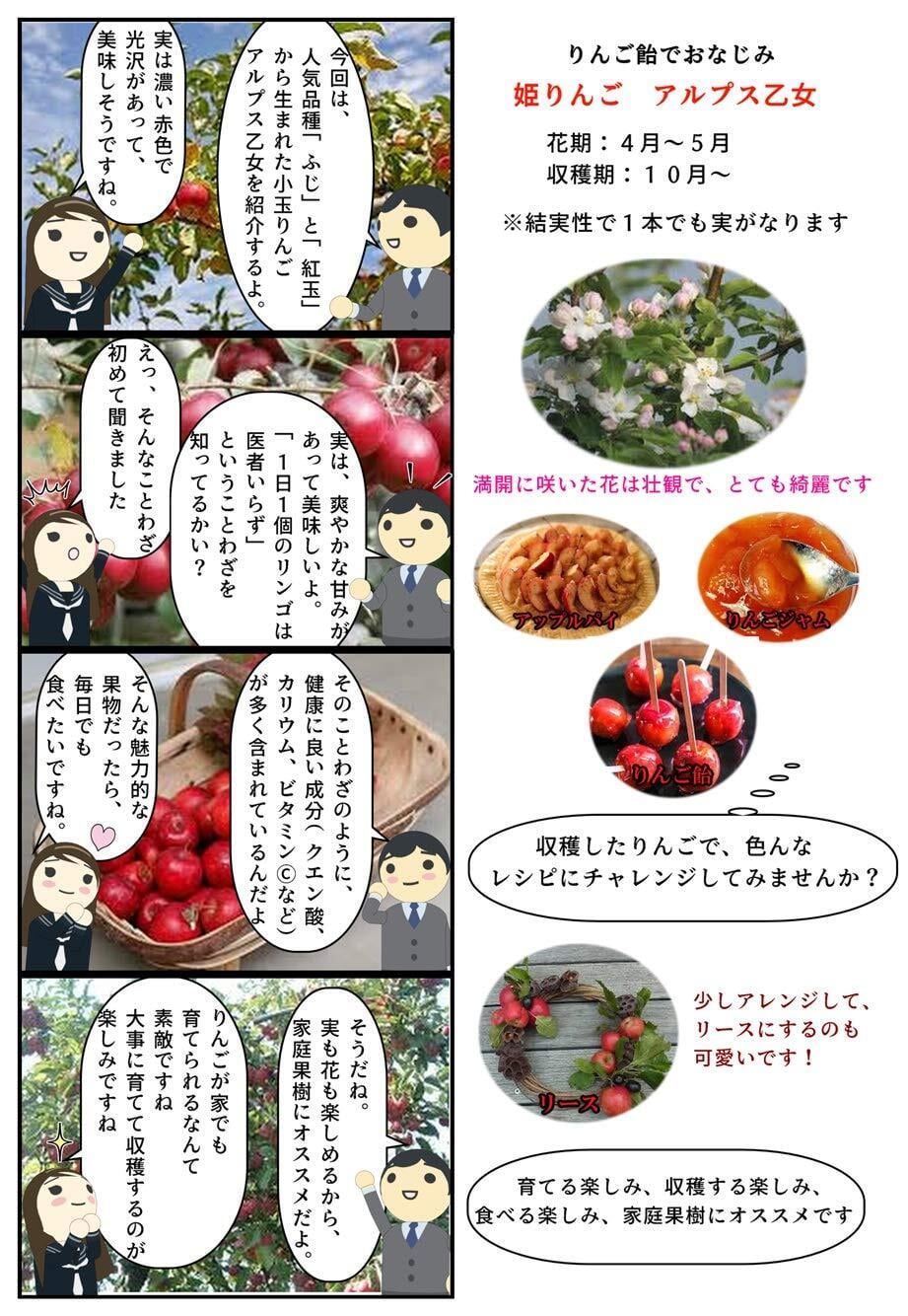 果樹りんご苗アルプス乙女りんご アルプス乙女は直径4~5cm前後のミニりんごです。重さ30~50gくらいと小さく、果皮は真っ赤で軸はやや長くて、とてもかわいらしい姿をしています。甘味の中にほどよい酸味があり、果汁も多めです。小さいながらもりんごらしい風味が味わえます。