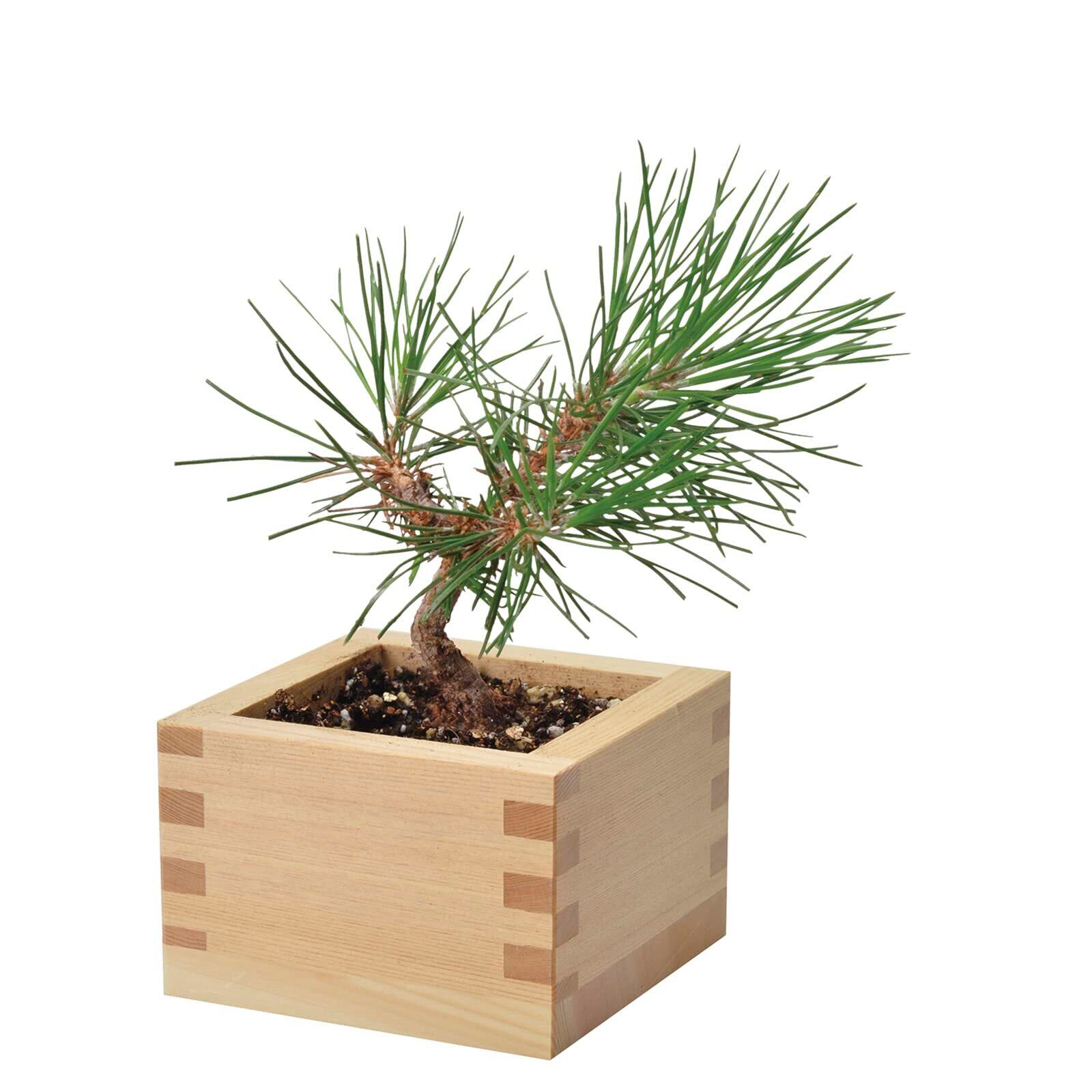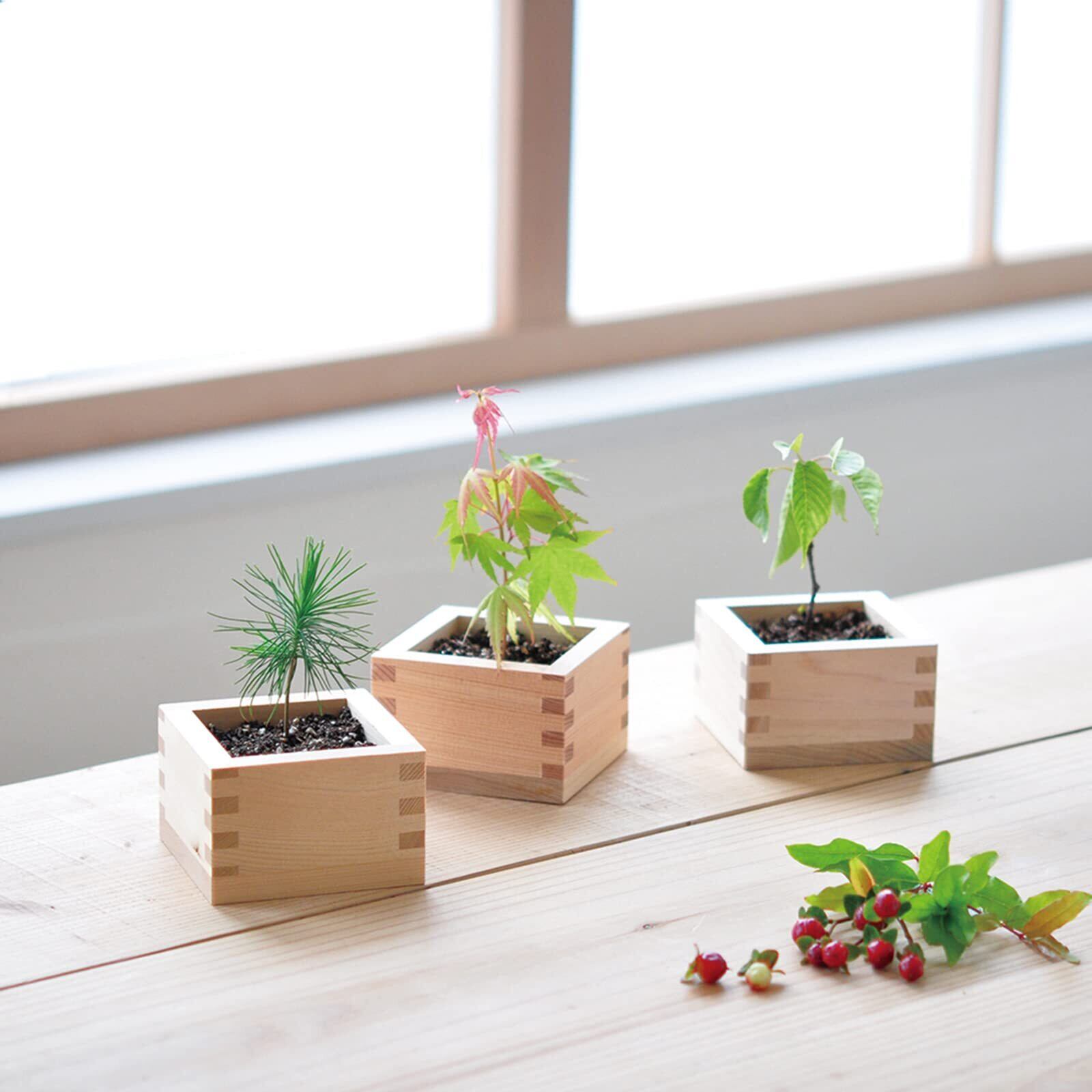 ヒノキ桝で小さな樹木を育てる盆栽栽培セット