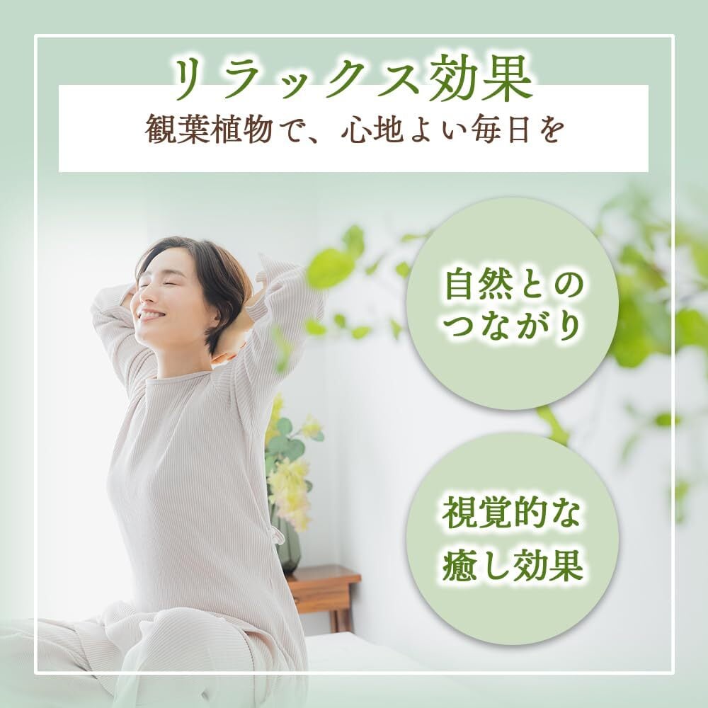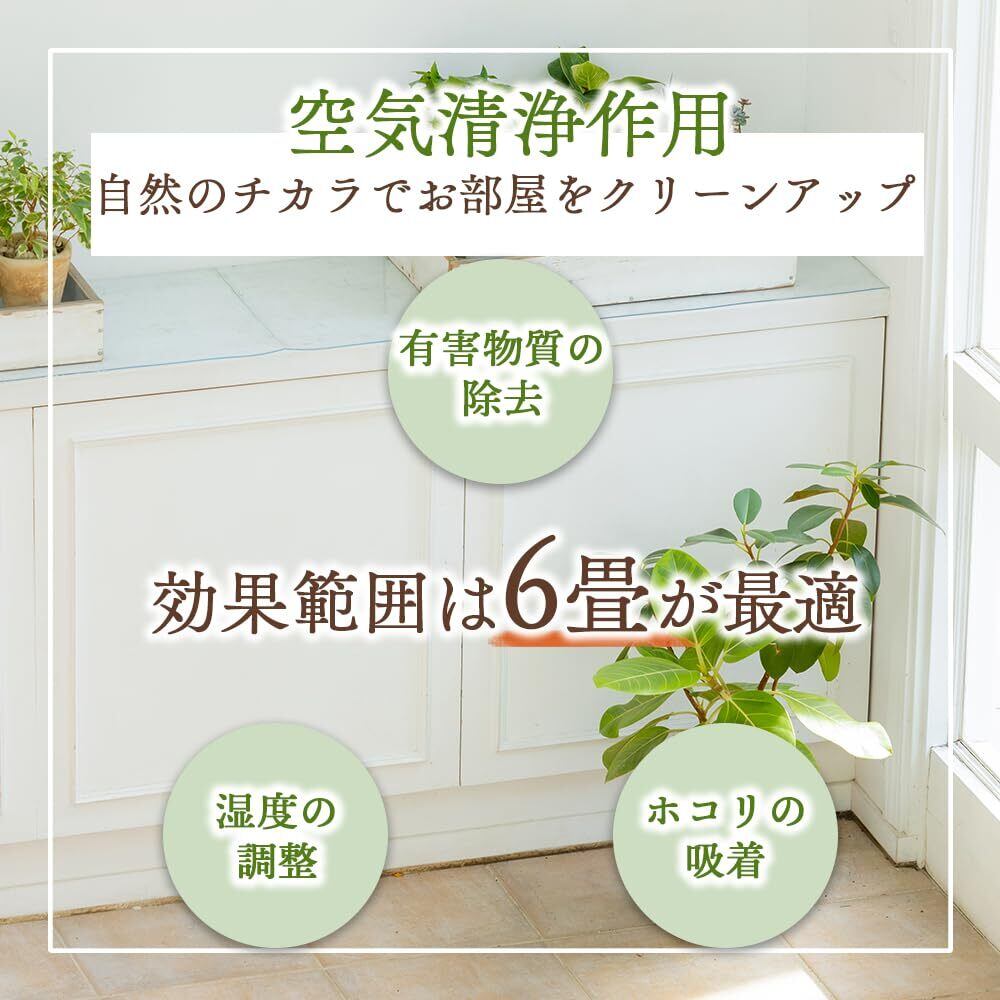 空気清浄効果:効果の範囲は6畳程度のお部屋に1~2鉢の植物が理想的です。 湿度の調整、ホコリの吸着、有害物質の除去などに効果があると言われています。