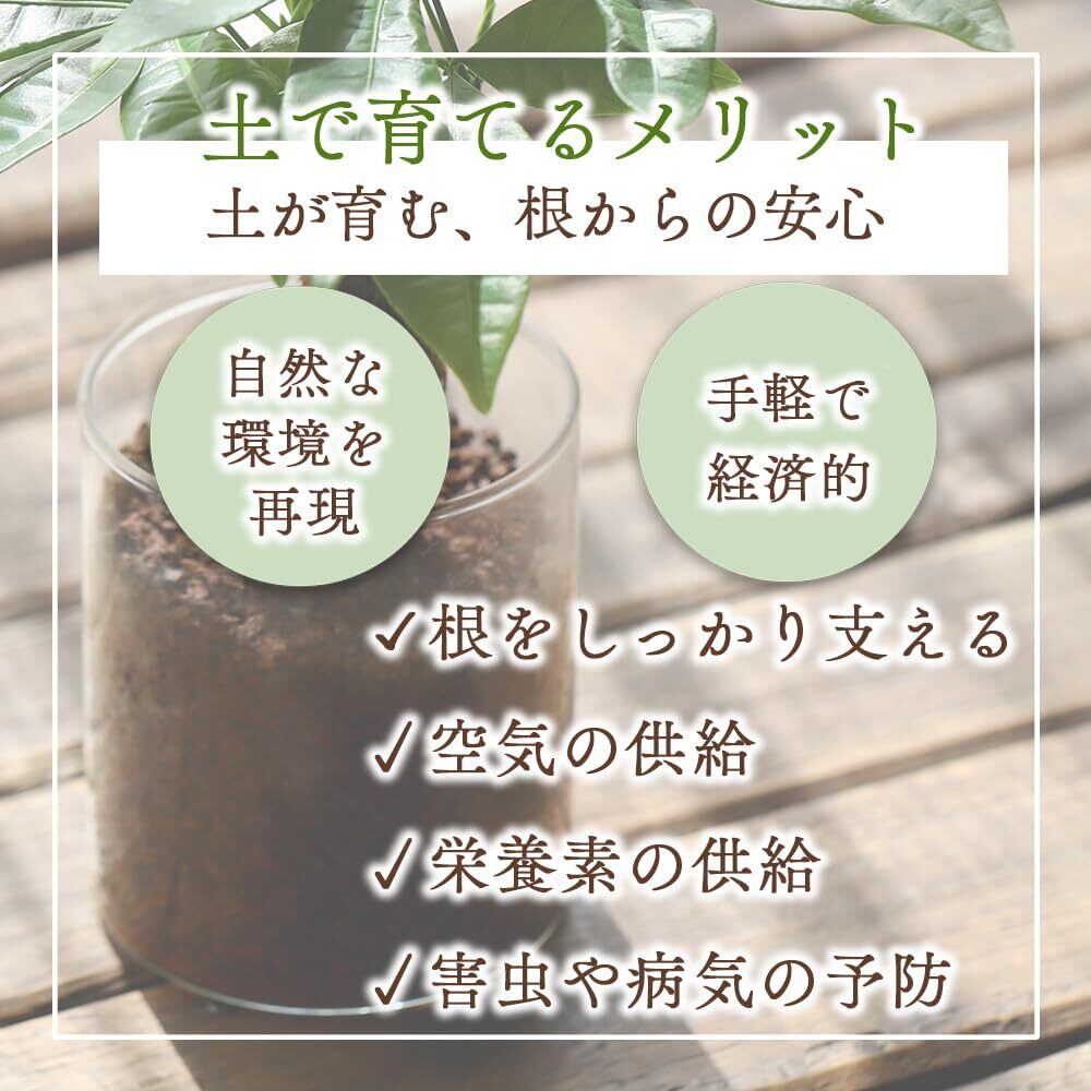土で育てるメリット:土壌に含まれる微生物は植物の健康を支え、栄養の吸収を助ける働きをします。また、土は適度に水分を保持するため、過湿や乾燥を防ぎ、水やりの管理がしやすくなります。これらの特性により、植物は健全に成長しやすくなります。