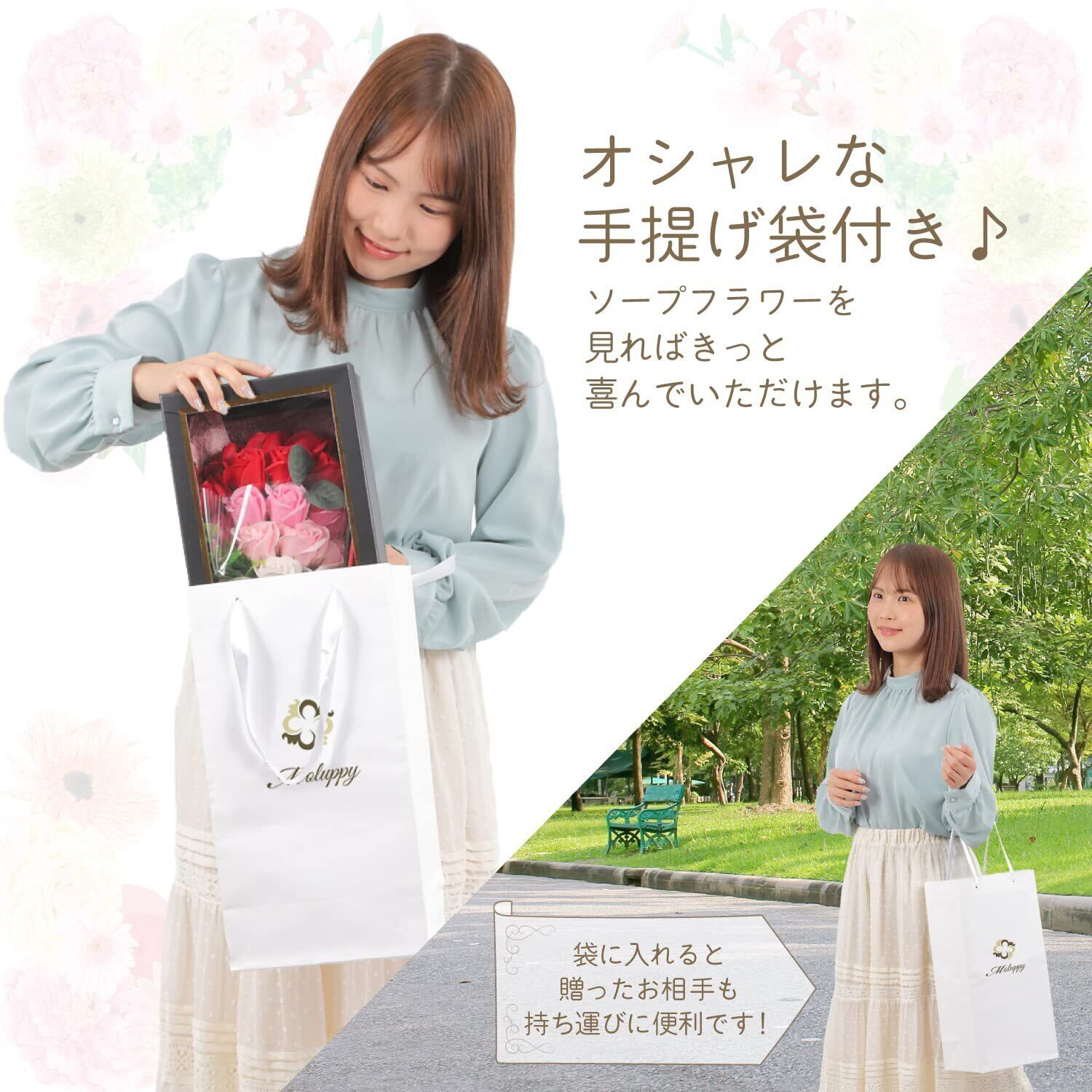 Moluppy ソープフラワー 花束 持ち運びに便利な 紙袋付き ボックス付き バラ 18本 グラデーション レッド 赤 薔薇造花 誕生日 記念日 お祝い 送別会 ギフト プレゼント