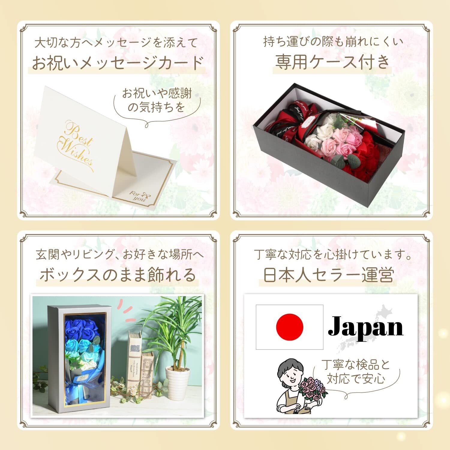 【ギフトボックス付】ギフトボックスに入っていて、花が崩れにくい。ブレゼントとして渡しやすいです。