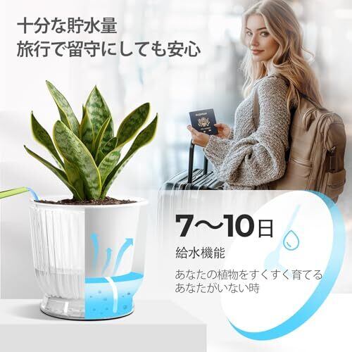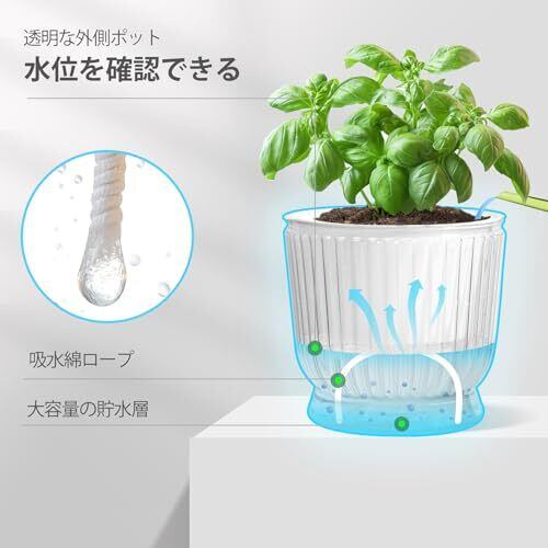 「自動給水機能付き」革新的な2層設計を採用し、綿ロープで外部の貯水層の水分を吸収し、インナーポットの土に自動的に水を供給する仕組みです。水不足または過剰な水分供給による根腐れなどのトラブルを軽減します。週に1〜2回の水やりだけで、時間を大幅に節約できます。出張や旅行中でも、植物が枯れる心配はありません。したがって、多忙な植物愛好家や初心者にとっては、理想的な選択です。