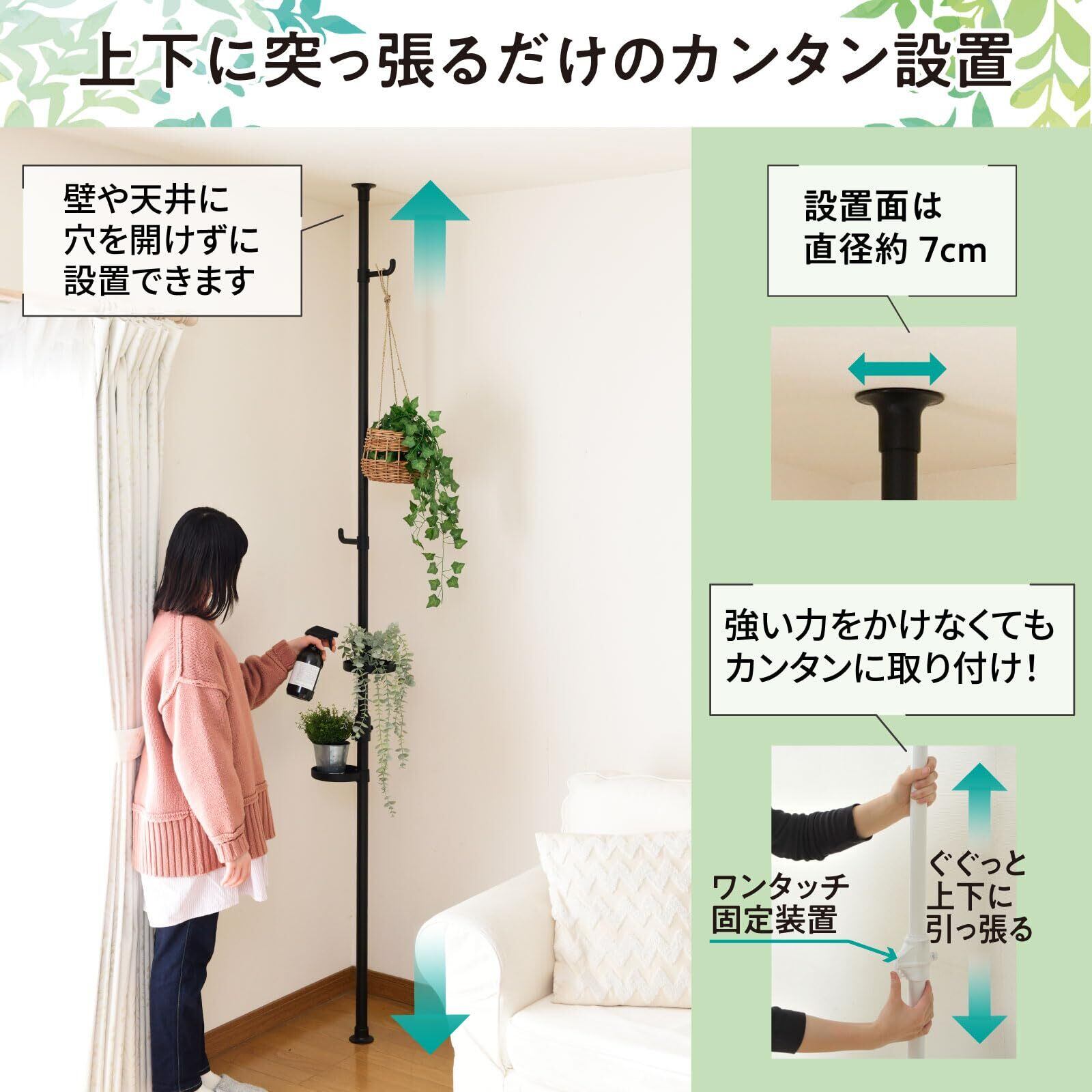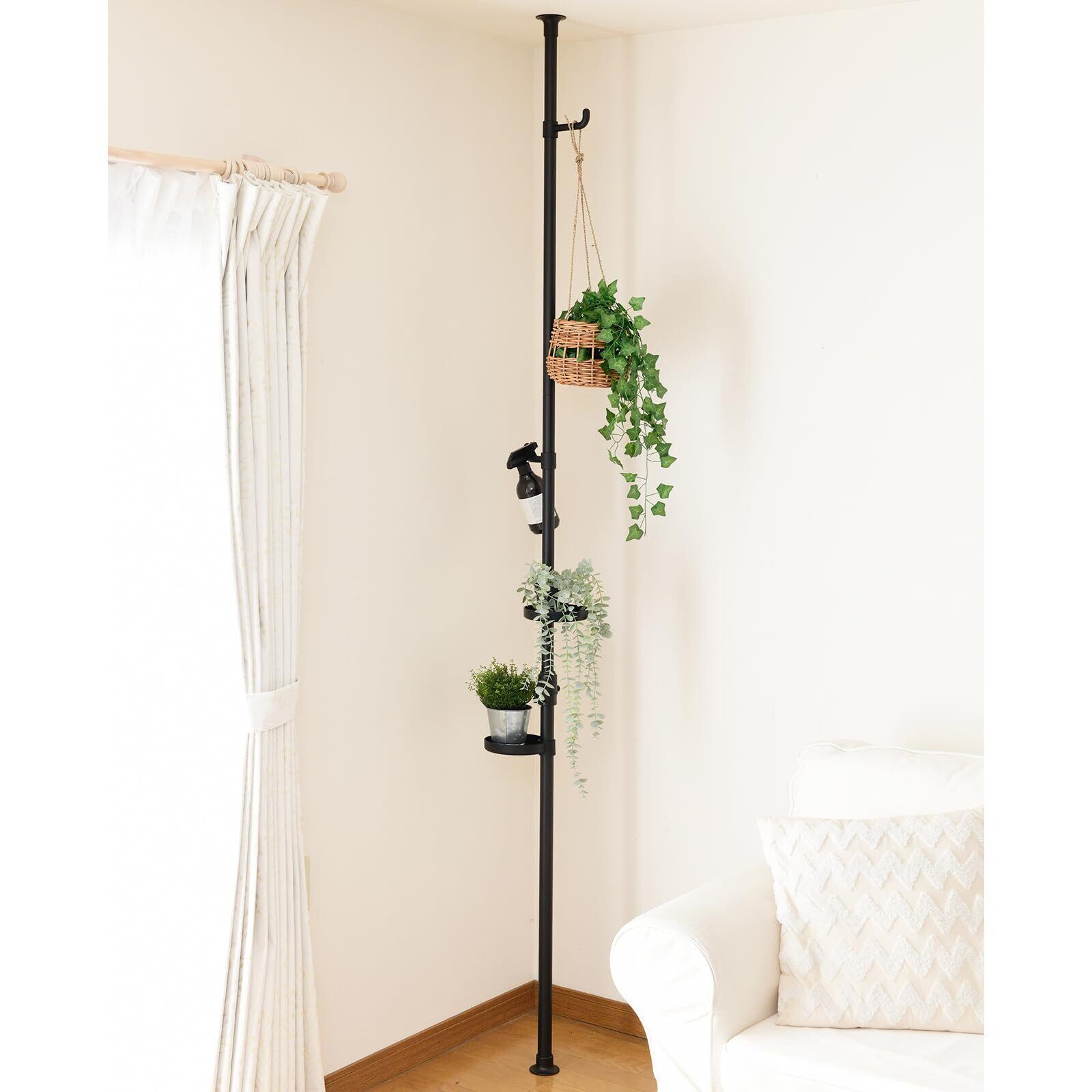山善(YAMAZEN) 突っ張り ラック ポールハンガー プランタースタンド ワンタッチ突っ張り (実用新案取得済) 幅30×奥行30×高さ190-260cm フラワースタンド 室内 トレー2個・フック2個付き 組立品 マットブラック WJE-11RM(MBK) | KSショップ