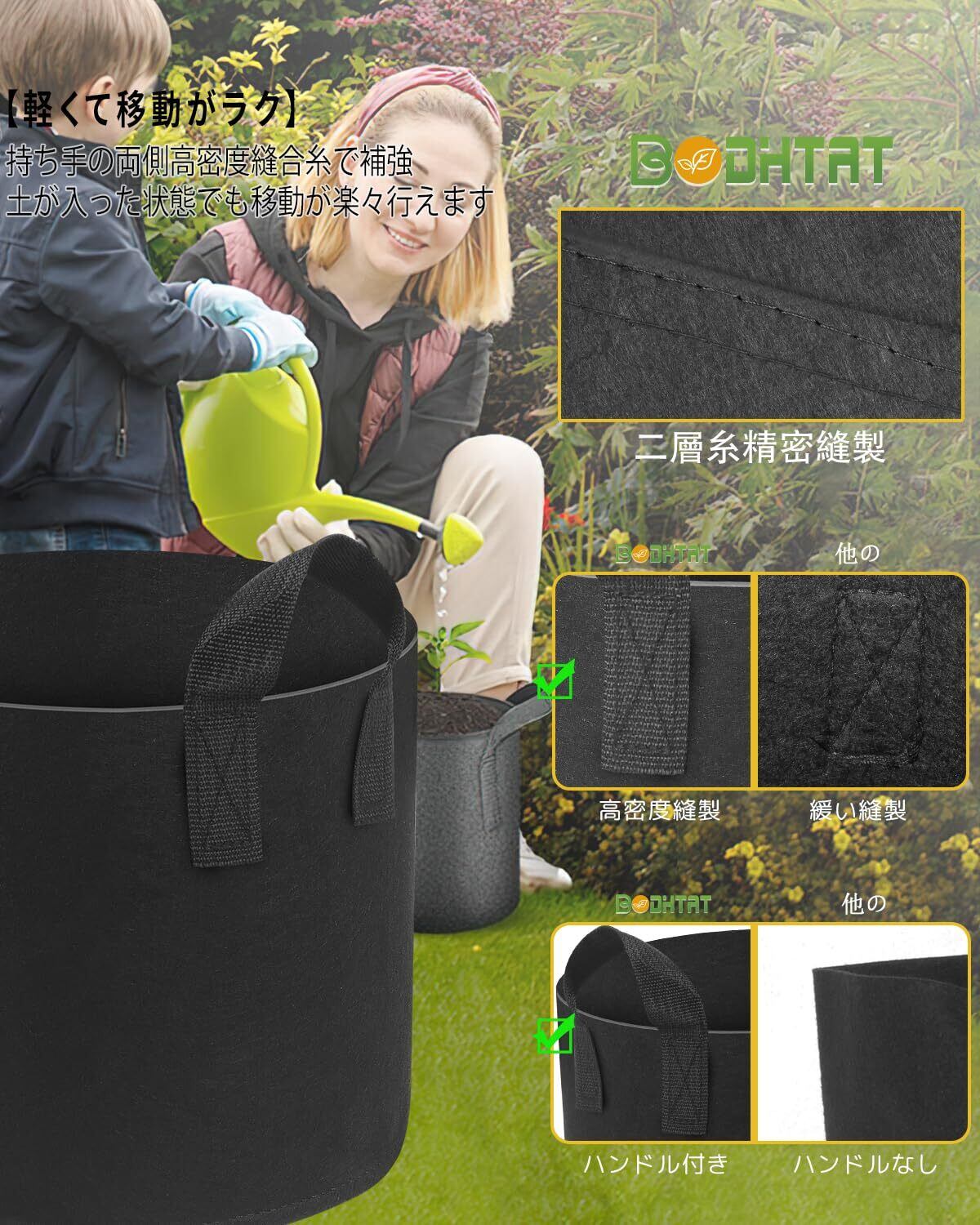 【軽くて移動がラク】不織布素材はとても軽量なため、持ち運びが簡単。持ち手の両側高密度縫合糸で補強-土が入った状態でも移動が楽々行えます、陶器やプラの植木鉢より、形がフレキシブルに変えられるので、きは折り畳んでコンパクトに収納できます、限られたスベースに入れられ