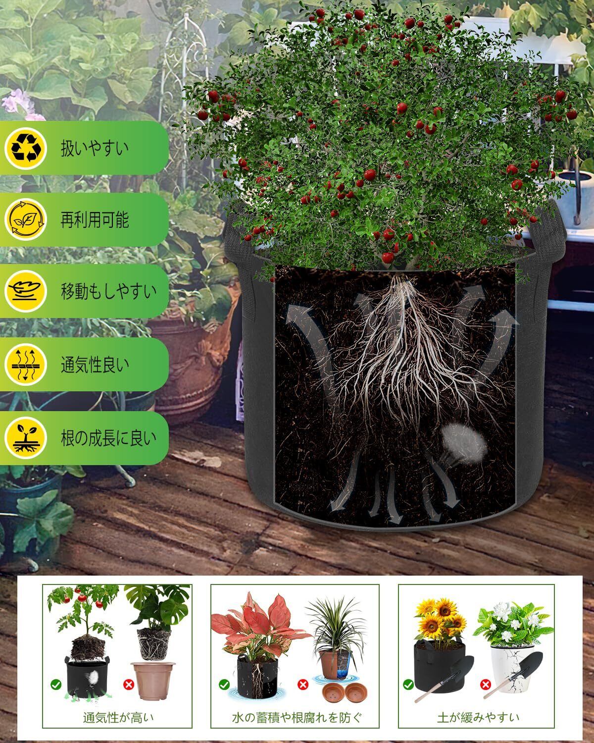 【排水性がよく 根腐れはしない】しっかりとした厚手不織布の生地使用の植木鉢、通気性、浸透性が良い、で鉢底石はいらなそうです-植物が根腐れを起こす心配がありません、植物の生存率を改善できます。乾ききるまでが早く-簡単に腐食しない、水はけの良い土を好む植物を植えれば上手く育つ。鉢植え、果樹、野菜を栽培用に非常