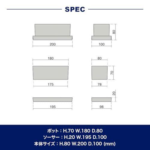 サイズ : S、高さ80×幅200×奥行100mm、ポット : 高さ70×幅180×奥行80mm、受皿 : 高さ20×幅195×奥行100mm