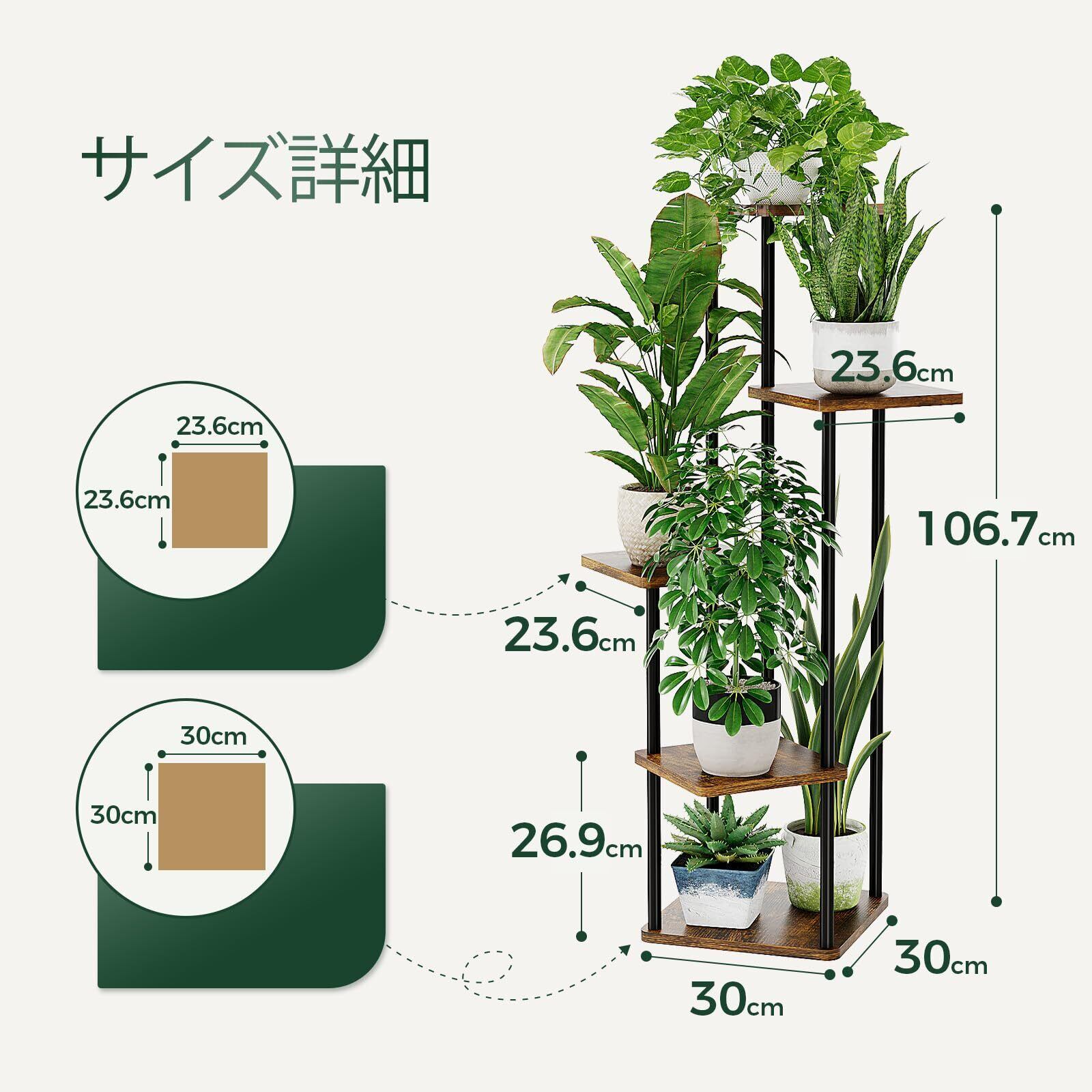 コンパクト空間に最適:全体幅縦47cm×横47cm×高さ106.7cmの5段植木鉢スタンドは、壁隅やキャビネット横にスムーズに配置可能なコンパクトデザイン。多層構造により植物の収容量を最大化し、狭い空間でも緑豊かなインテリアを実現します