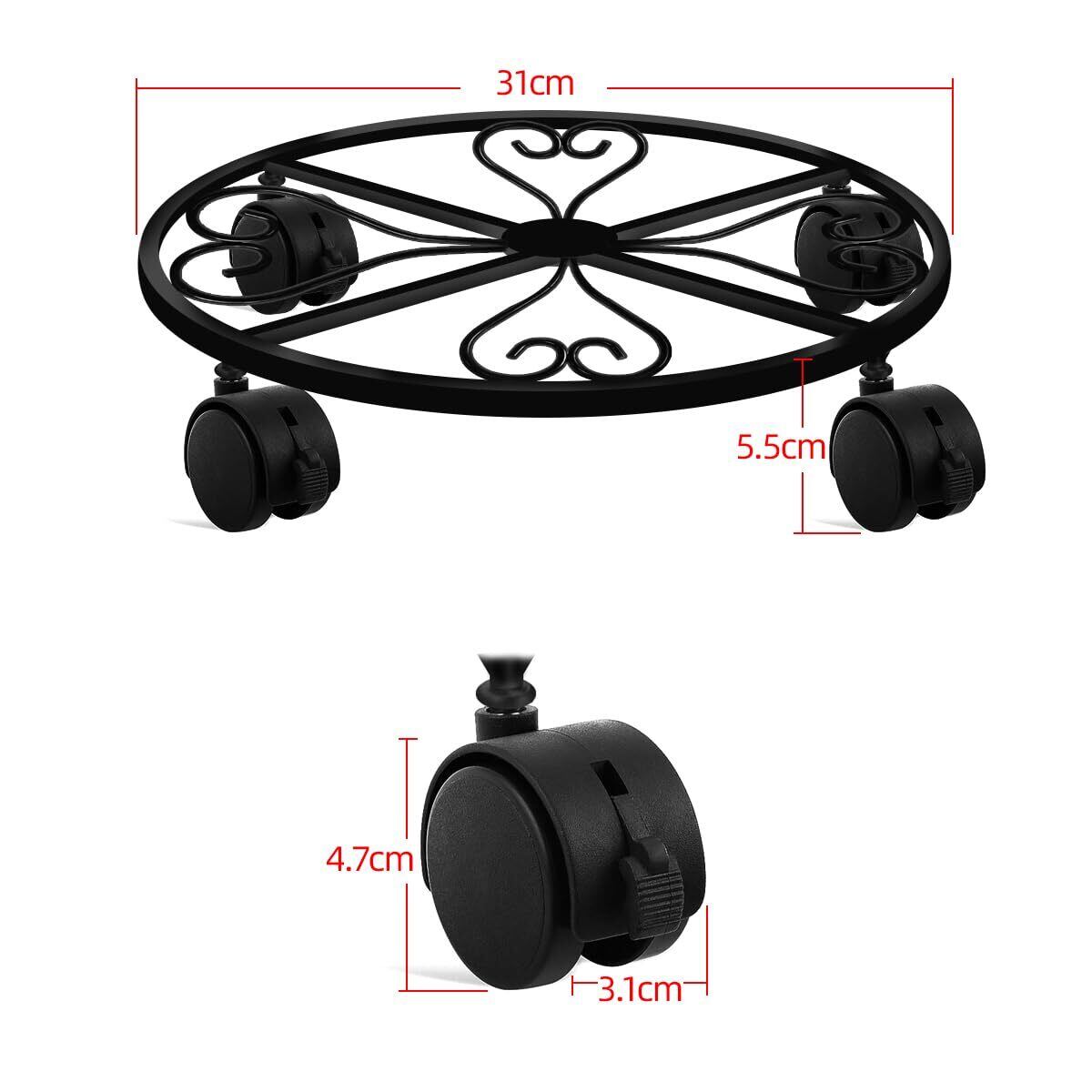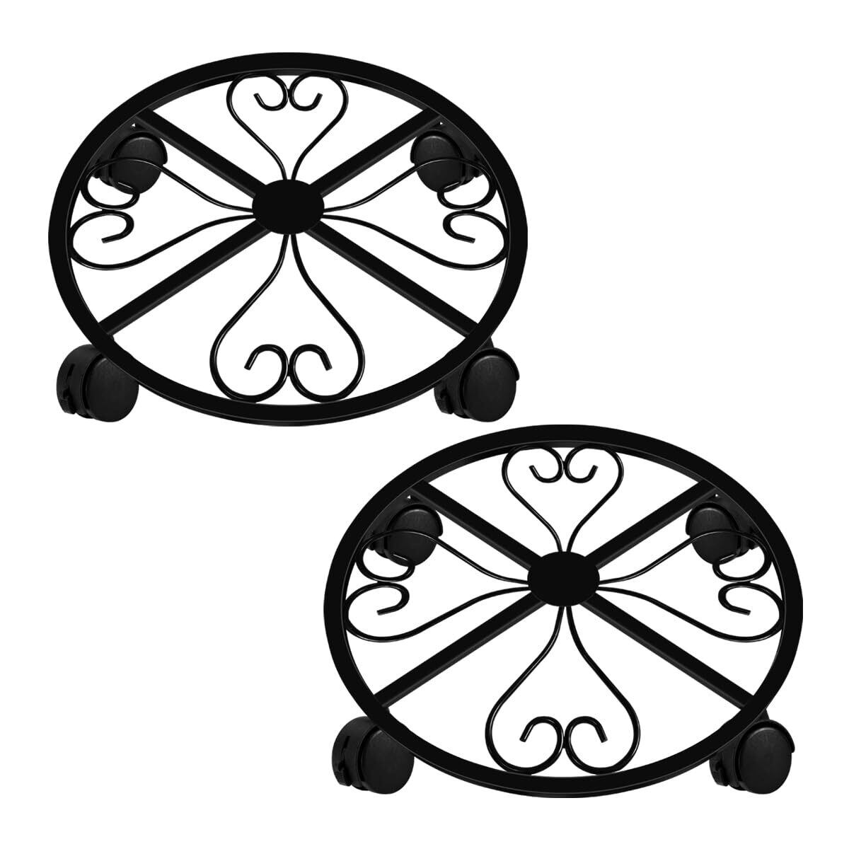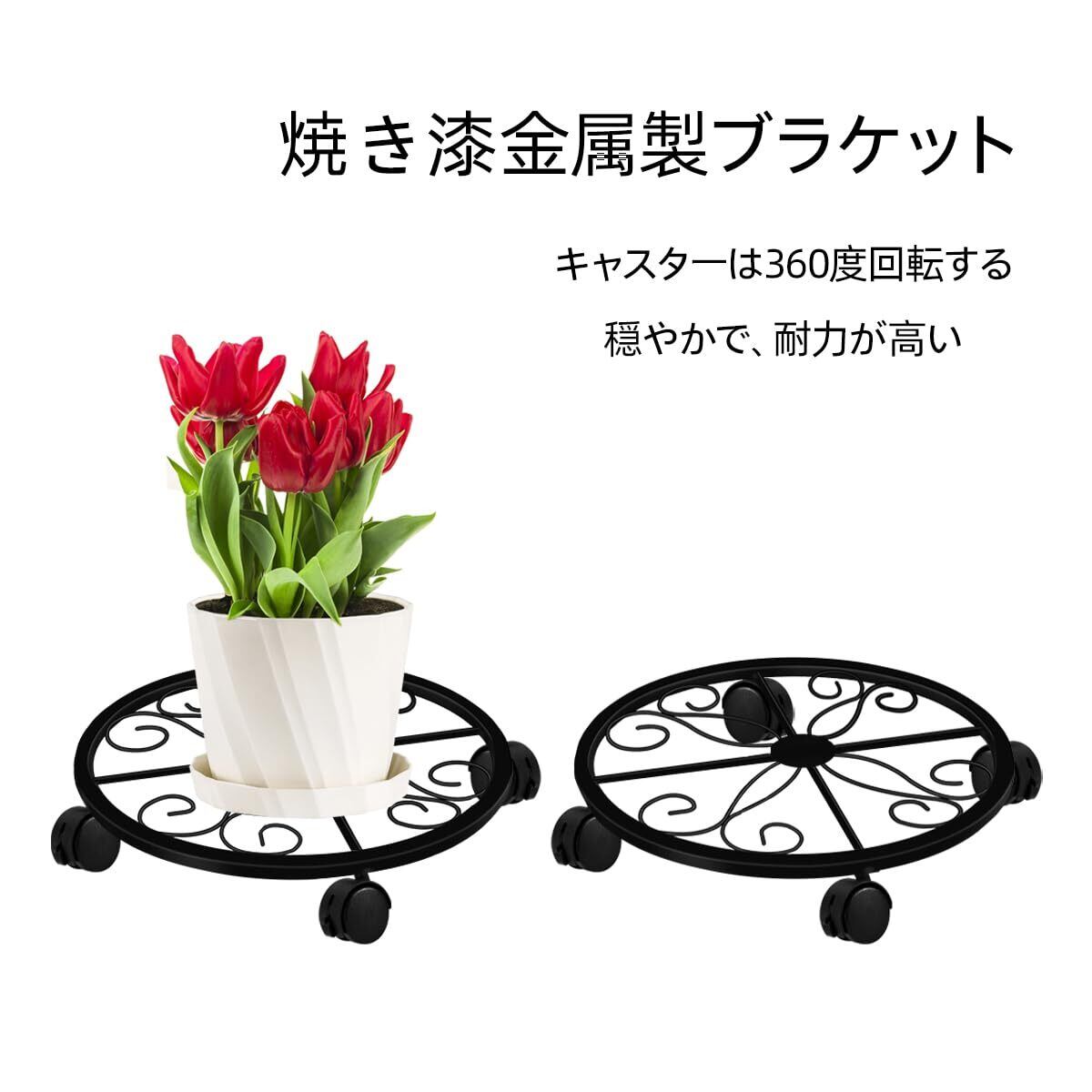 2点セット金属植木鉢フレーム車輪付き、重型防錆鉄植木鉢フレームブレーキ車輪、屋内外装飾棚、円形層化植物スタンド、360度回転キャスター、家庭と庭の装飾に適用(ブラック)