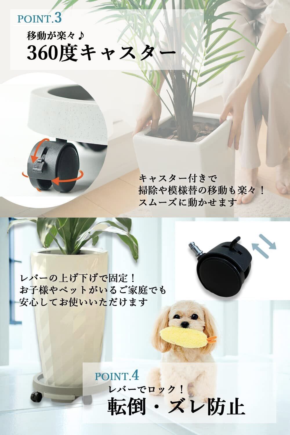 【 移動に便利なキャスターも 】 大きな植物を移動させるのは大変ですよね。本製品には、移動に便利なキャスター付きとなっております。床を傷つけることなく安心して植木鉢や花瓶、大型植物プランターなどを簡単に移動できます360°回転するので移動もスムーズです!キャスターは、工具不要の簡単取り付けですので、どなたでもお使いいただけます。また、ロックができるのでお子様やペットのいるご家庭でも心配ありません。