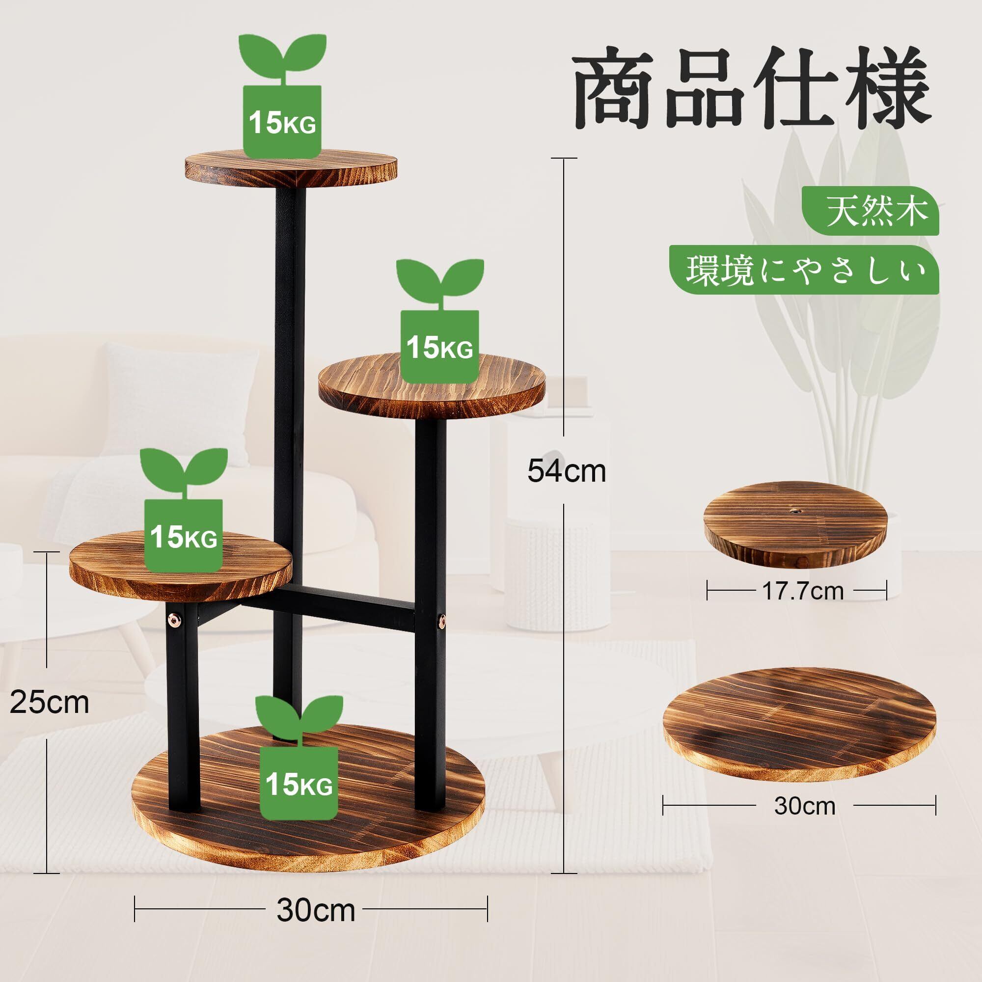 【商品仕様】本体寸法:(約)幅30cm×奥行30cm×高さ54cm【本体重量】 (約) 1.4kg【梱包サイズ】 45 x 31 x 6 cm。木製の素材を使用したプランタースタンドは、ナチュラルで温かみのある雰囲気を与え、さまざまなインテリアスタイルに適しています。