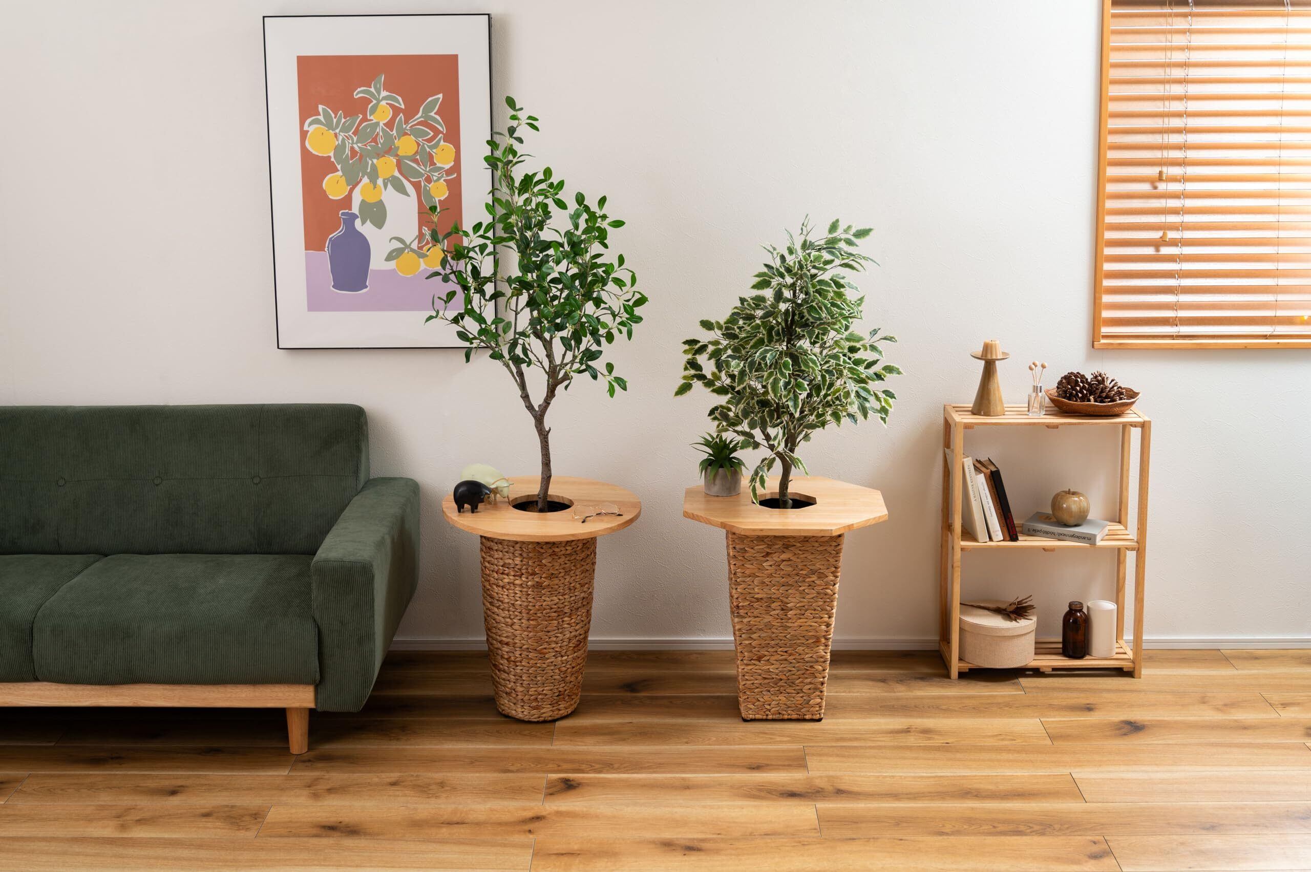 天然木のぬくもりを感じる北欧風デザインの「helppo」シリーズより、プランターの上に設置するだけで、観葉植物がおしゃれなテーブルになるアイテムが登場しました。ダボをはめ込むだけで簡単にセットする事が可能です。やさしい印象のサークルタイプと、壁付けが可能なオクタゴンタイプの2種類ご用意しました。