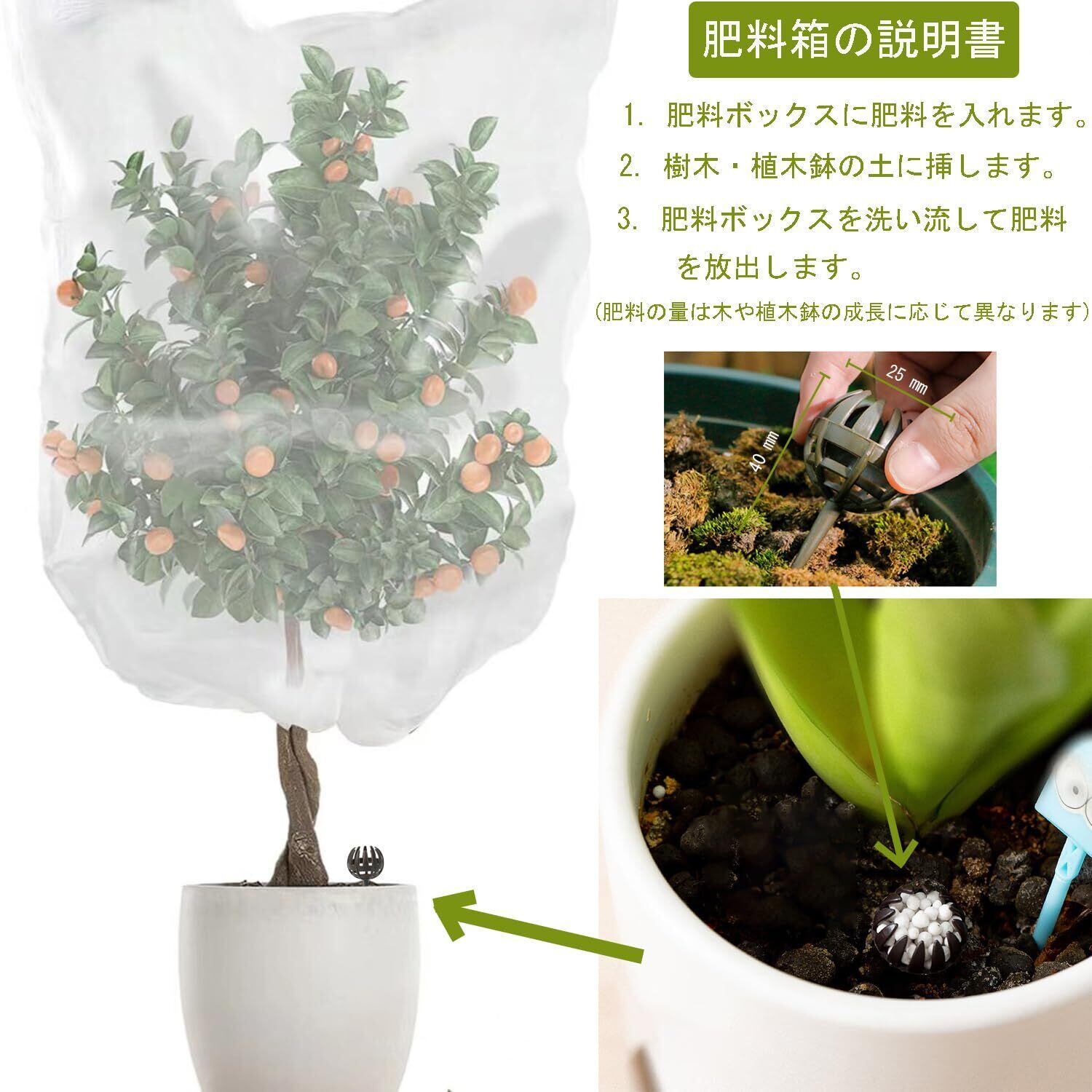 【 果樹袋 仕様】 素材:ナイロン、 サイズ:高800 * 幅600 mm、 セット内容:果樹袋1枚入り、肥料ボックス1個(サイズ:高40 * 幅25 mm) 、色:ホワイト。(手動測定のため、わずかな測定誤差はご容赦ください。) 植物のサイズが小さい場合、2〜3鉢をまとめてネットをかけて使用出来ます。