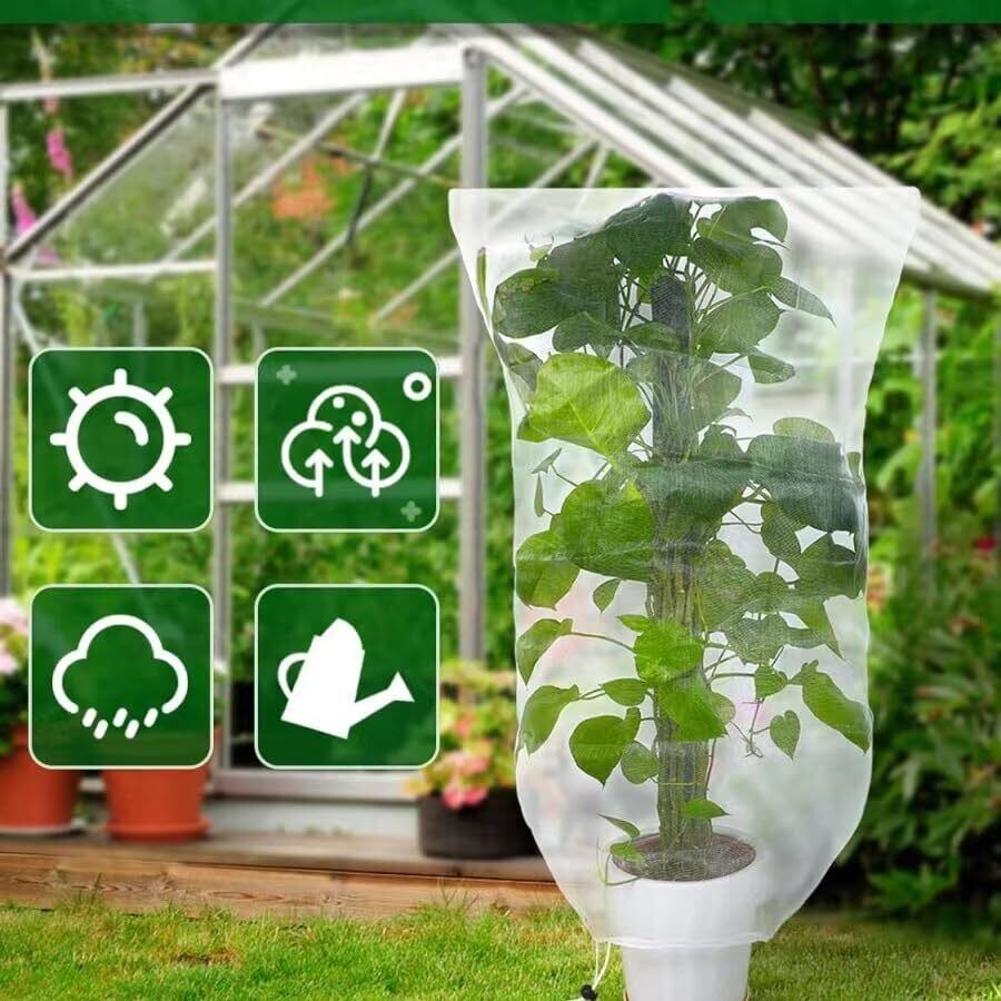 【取付け簡単園芸用ネット】巾着式引き紐と広い開口部があり、花や木を直接覆い、プラントの高さや大きさに合わせて保護カバーを自由に調整できます。底部は大きさ調整可能な引き紐付き、カバーを締めることができ、安全性を増し、風の中で吹き飛ばされません。だから、強風の日にご使用いただけます。
