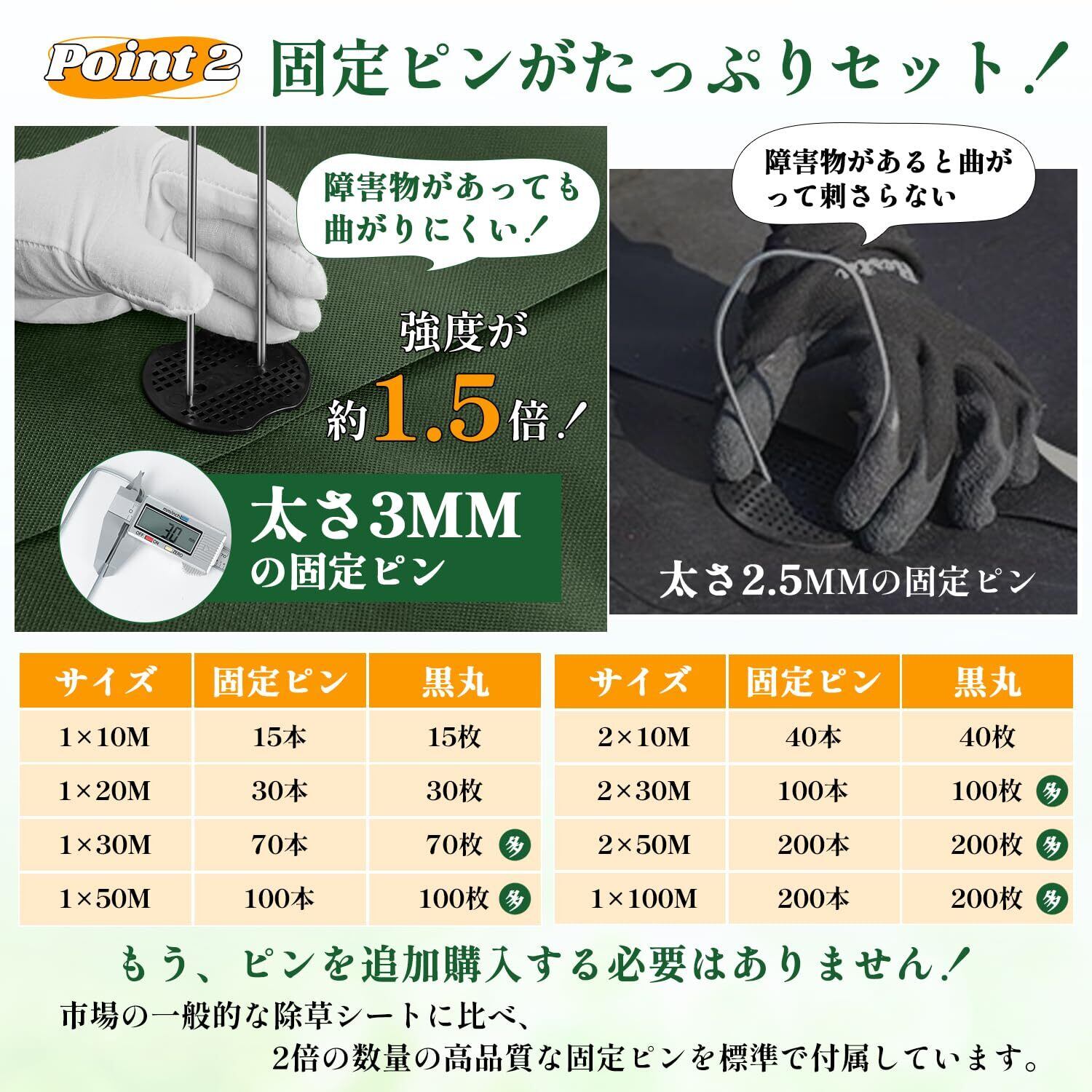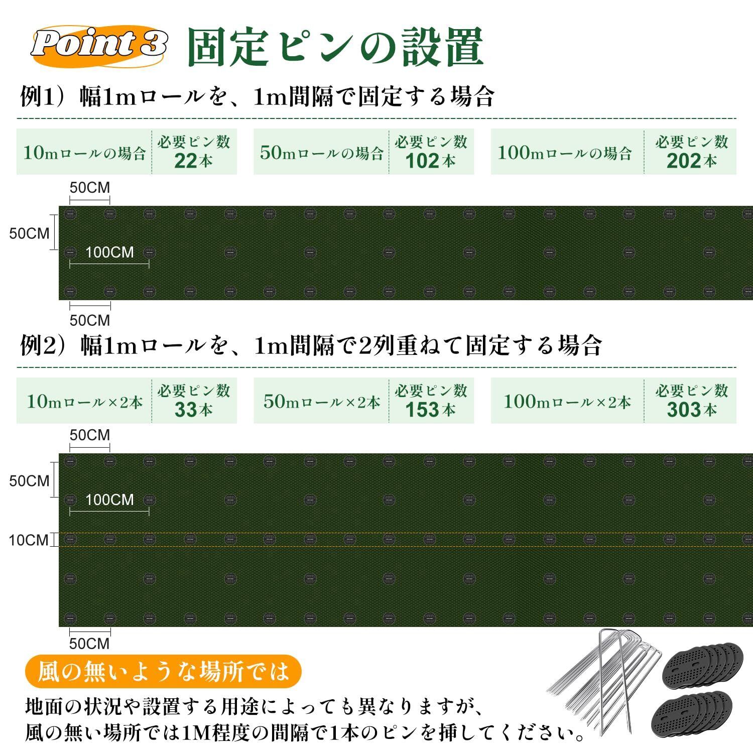 【届いてすぐに使える!充実の付属品】「いざ敷こうとしたらピンが足りない…」そんなお客様の声を反映し、他社の同サイズ(2×50メートル防草シート)の付属品が100本程度であるのに対し、当社の防草シート(2m幅50m巻の場合)には、たっぷり2倍の「U字固定ピン200本」を標準装備しています。これにより、シートのズレや浮き上がりを強力に防ぎ、別途ピンを購入する手間と費用を大幅に削減します。DIY初心者の方でも、プロのような仕上がりを簡単に実現できます。