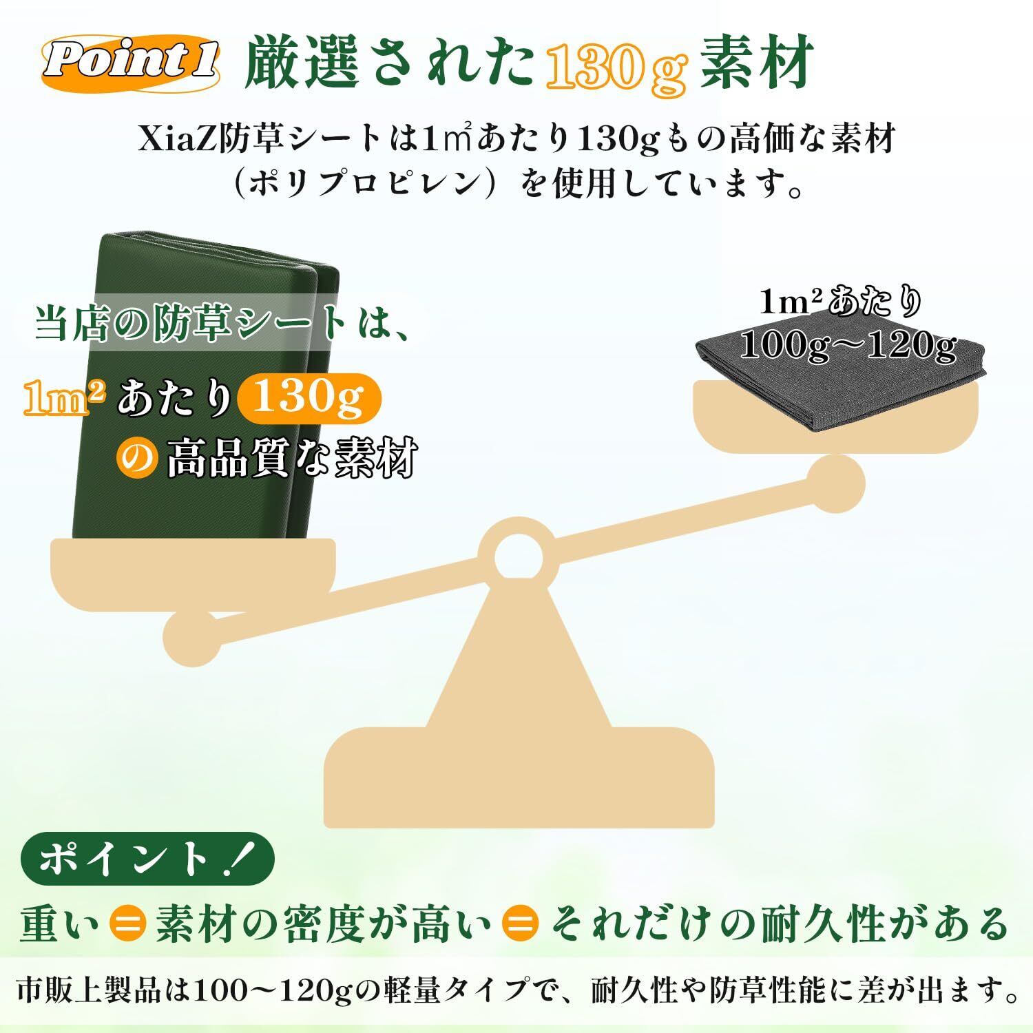 【遮光率95%以上!光を絶ち、雑草を根から枯らす】130G高密度の不織布高遮光性の素材を使用し、光合成を物理的に妨げることで、長期間にわたり雑草の光合成を強力に抑制します。太陽光を遮ることで、雑草の発芽・生育を根本から防ぎ、手間のかかる草むしりの回数を大幅に減らすことが可能です。除草剤を使いたくない、小さなお子様やペットがいるご家庭でも、安心してご使用いただけます。大切な庭木や花壇などの枯らしたくない植物に影響しません。
