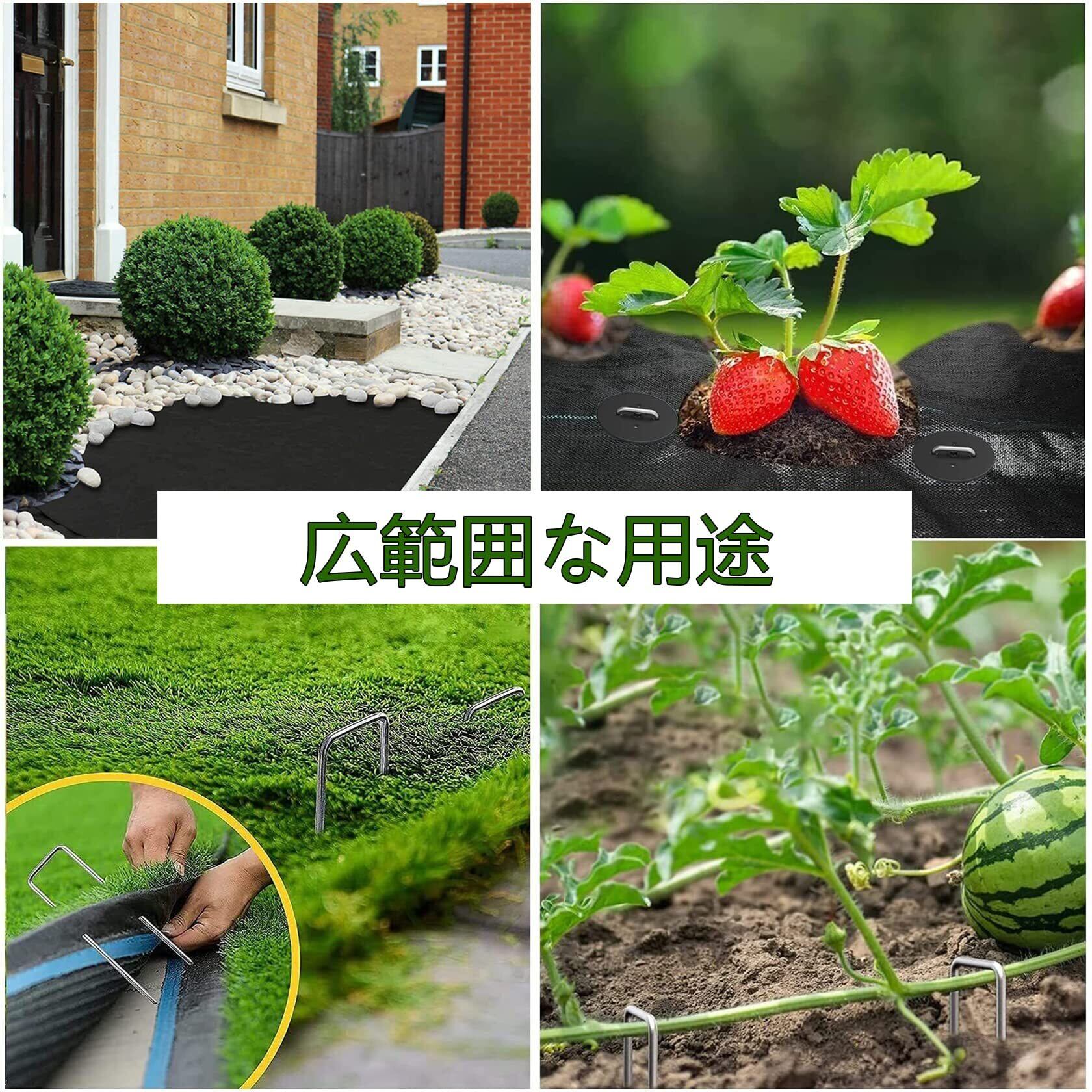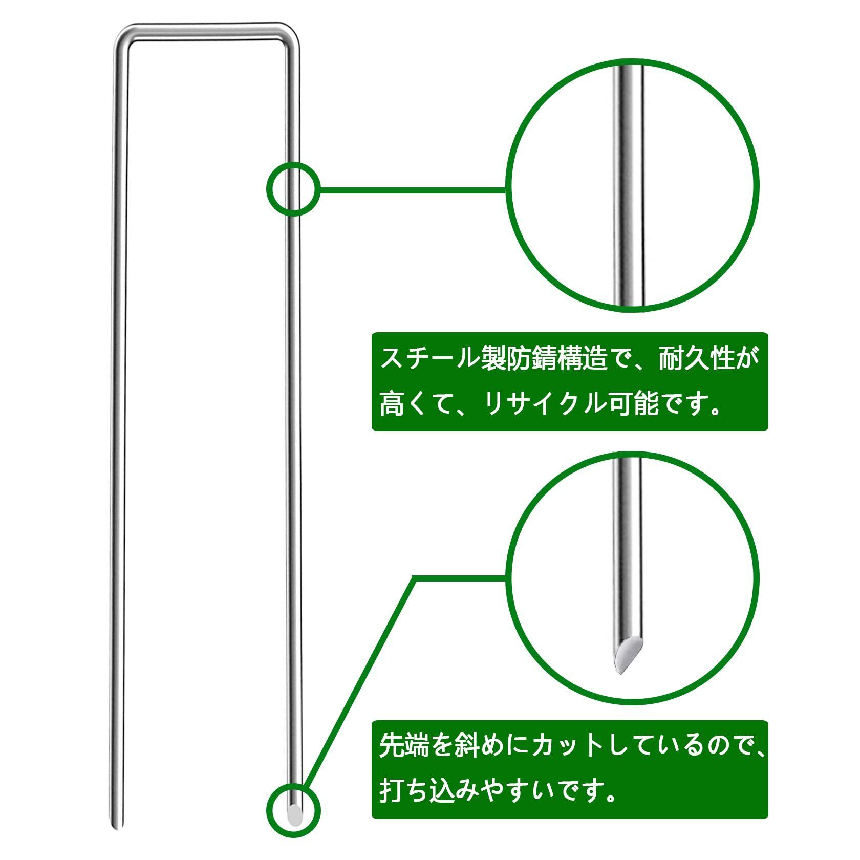 【用途が広い】:防草シート、農業用防虫ネット、人工芝、ビニールマルチ、不織布、ザバーン、各種シート・マットなどの農業用品をしっかり地面に固定できる便利なU字ピンです。主にガーデニング、農業、庭などの場所に使われています。