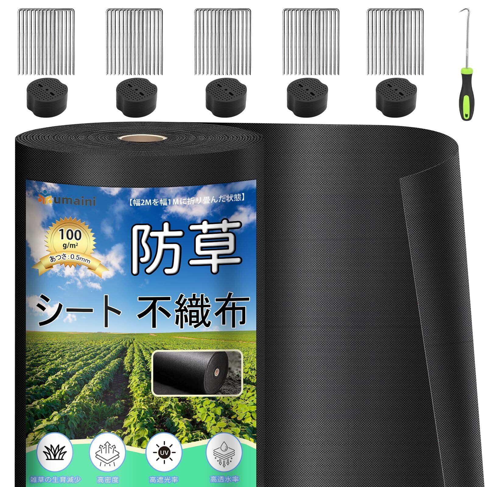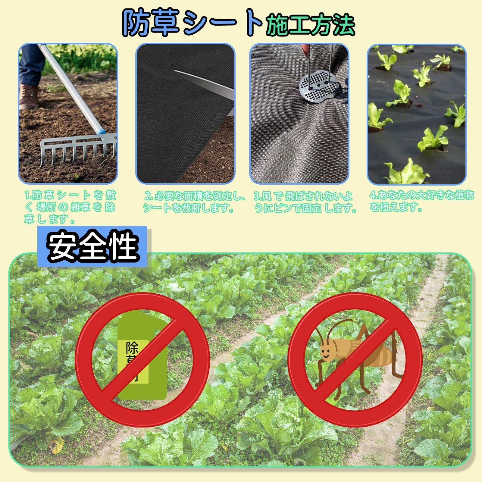 防草シート 厚手 高耐久 1×50M シート防草 不織布 除草シート補修テープ 雑草防止シート固定ピン50本と黒丸50枚付き 家庭菜園 農業 工事用 園芸用 人工芝下 ブラック