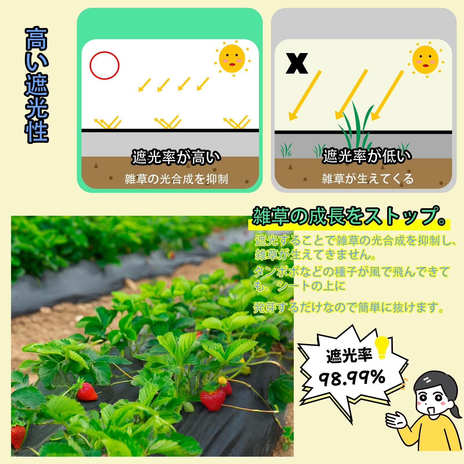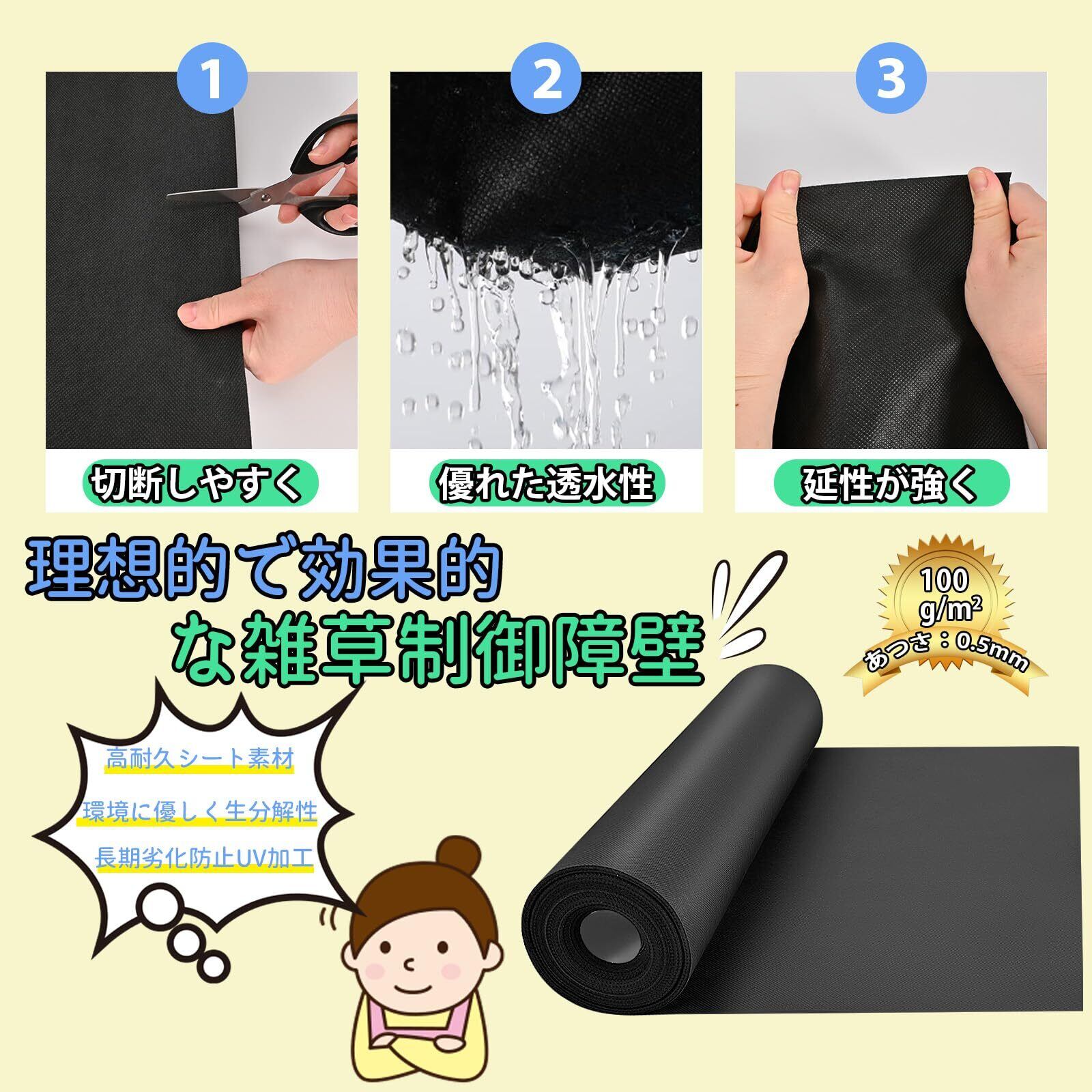 高耐久設計:防草シートは良質なポリプロピレン(UV耐候剤配合)を使用した高密度100g/m²不織布材料で作られ、従来の防草シートに比べて厚みがあり、悪天候条件に耐え、高い引張強度と耐引裂き性を持ちます