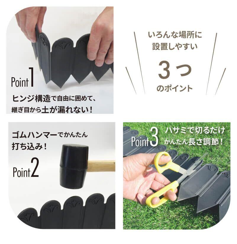 【本体サイズ】(約) 高さ27cm×長さ3m 【用途】芝の根止め、花壇作りに。お隣りへの土の流出を気にせず簡単にガーデニングが楽しめる。ぐるっと囲うだけで野菜畑も簡単に作れます。