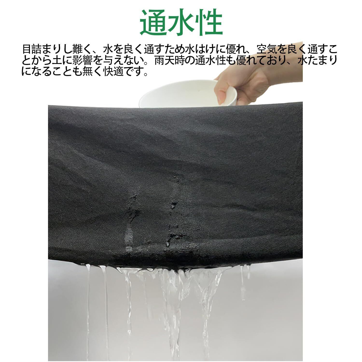 【通気性&3%親水剤入】目詰まりし難く水を良く通すため水はけに優れ、空気を良く通すことから作物の根の呼吸に役立ちます。水を通しやすいエンボス加工を採用。使っていくうちに自然と水になじみ、通水効果も上がります。雨天時の通水性も優れており、水たまりになることも無く快適です。