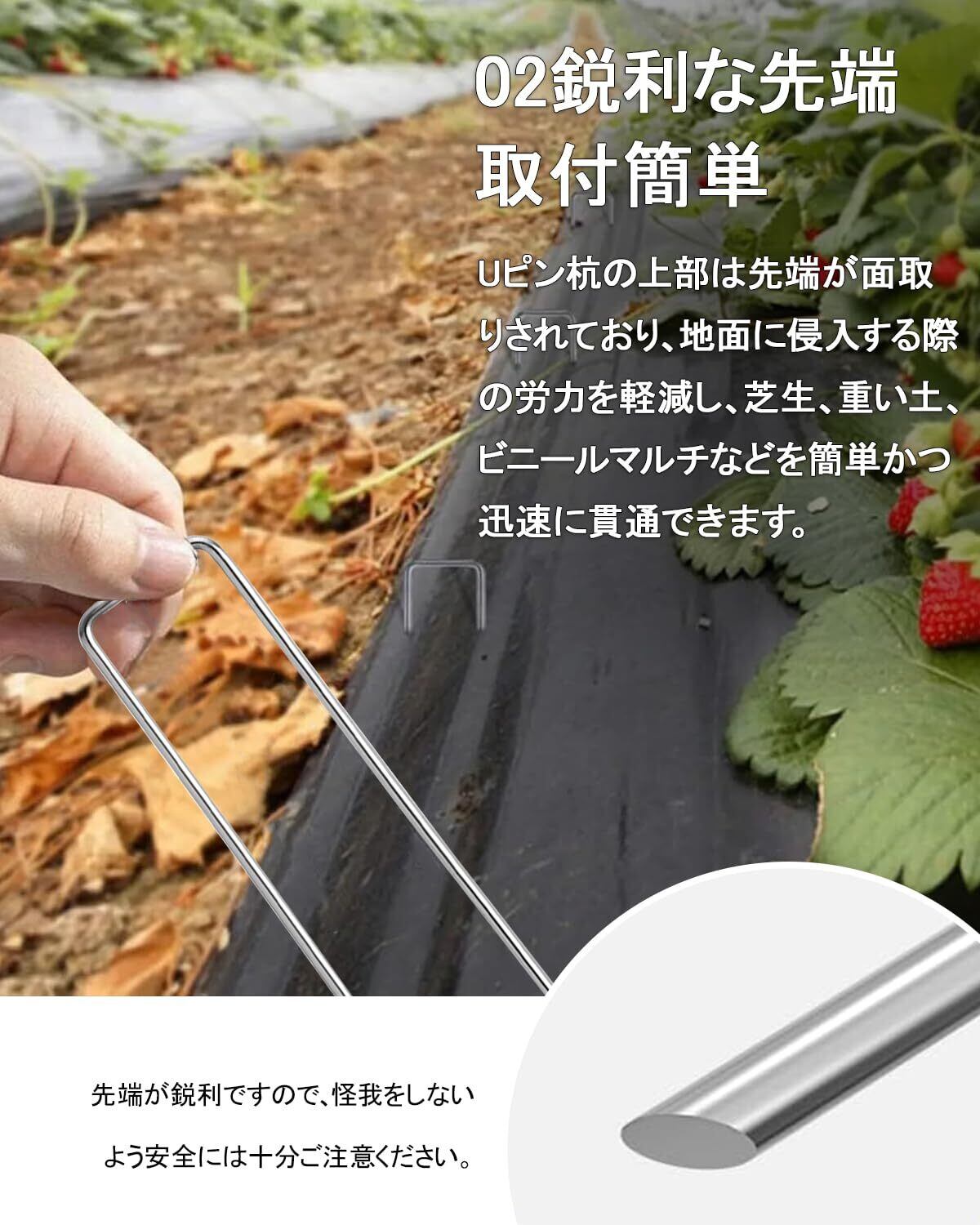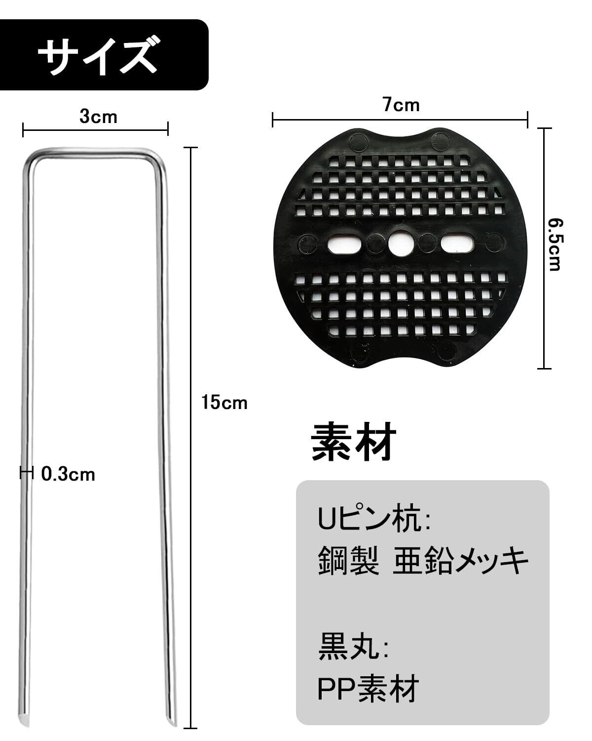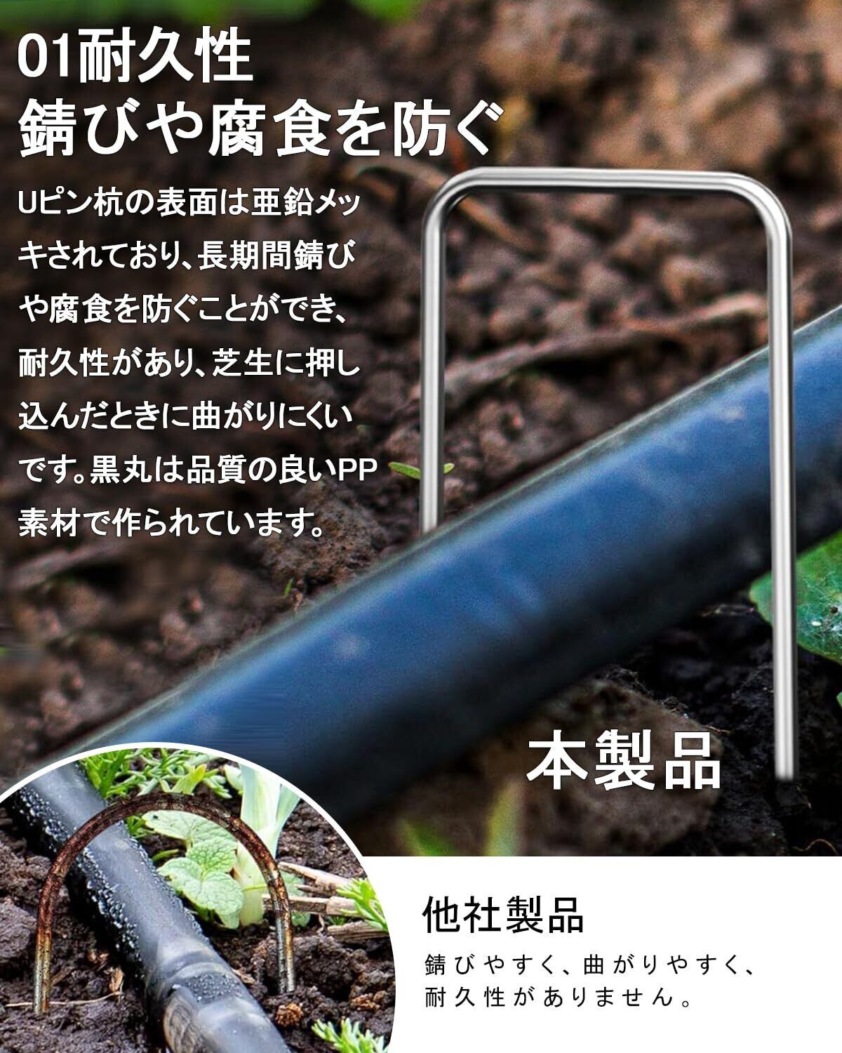 【マルチな用途】防草シート、除草シートはもちろん、農業用防虫ネット、人工芝、不織布、ビニールマルチ、園芸シートなどの各種シート・マット等の園芸用品をしっかり地面に固定させる押さえピンとして、また、ガーデニング・農業・庭用だけでなく、キャンプの時テントの固定ピンとしておすすめです。