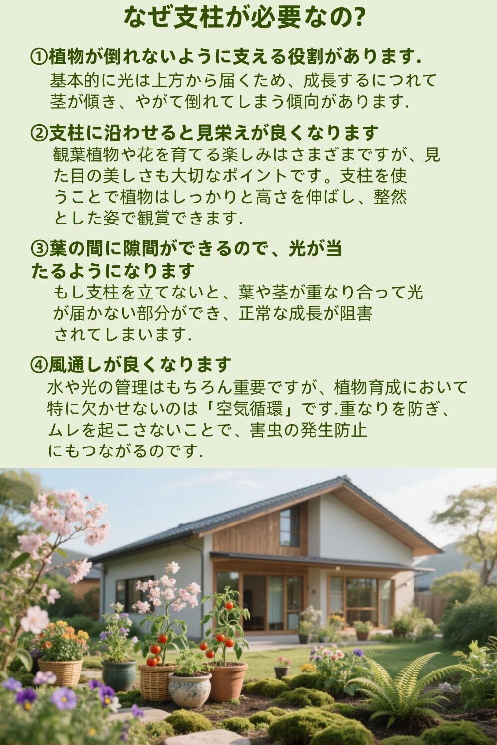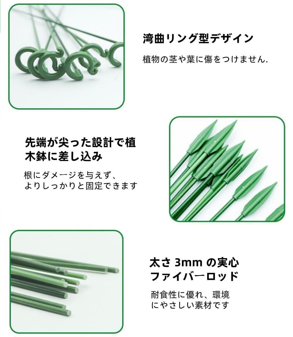 【自然に溶け込む滑らかな緑色デザイン】滑らかな表面処理とナチュラルグリーンのカラーにより、植栽に無理なく馴染みます。茎を真っ直ぐにサポートすることで、枝やつるの横方向への伸展を制御し、見栄えの悪化やスペースの無駄な占有を防ぎます。美しい造形を維持しながら、植物の健康な成長をサポートするデザインです.