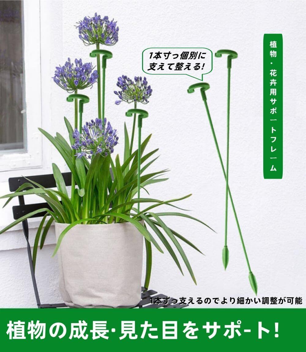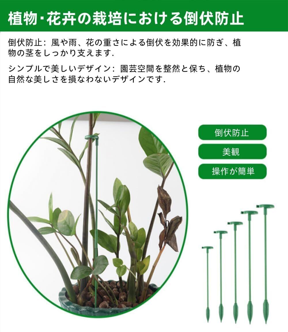 【先端尖り設計 × 長さ調節可能な G 型支柱】土への差し込み性を高めた尖った底部デザインと、植物の成長段階に合わせて支柱の露出長を自由に調節できる構造を採用。業界初の G 型フレームは、幼苗期から成熟期まで植物の茎を安定してサポートし、在来品以上の発育状況の観察性を実現。独特の成長サポート機能により、初心者でも手軽にプロ級の栽培管理が可能です. 【自然に溶け込む滑らかな緑色デザイン】滑らかな表面処理とナチュラルグリーンのカラーにより、植栽に無理なく馴染みます。茎を真っ直ぐにサポートすることで、枝やつるの横方向への伸展を制御し、見栄えの悪化やスペースの無駄な占有を防ぎます。美しい造形を維持しながら、植物の健康な成長をサポートするデザインです. 【プラスチック製の高耐久性仕様】軽量で丈夫なプラスチック素材を使用し、優れた耐候性と形状保持力を備えています。風雨や紫外線に強く、長期使用でも変形・劣化しにくいため、四季を問わず屋外での利用にも適しています。繰り返しの洗い替えや保管も簡単です. 【組み立て不要!フレキシブルな取り付け】パーツの組み合わせ不要で、差し込みのみで簡単に設置可能。栽培面積に合わせて複数本を並べて使用でき、柔軟な対応が可能。シングルステーク式のリングデザインが茎をゆるやかに固定しながら、成長に必要なスペースを確保します. 【果物・花卉・野菜まで幅広く対応】トマト、バラ、ユリ、牡丹、アジサイ、蘭など、細い茎の植物から蔓性植物まで幅広く適用できます。屋内の鉢植えはもちろん、ガーデンやバーベキューエリアの植栽にも最適。葉物植物の整形や、果物の重量を支えるためにも有効で、収穫時の品質向上にも貢献します.