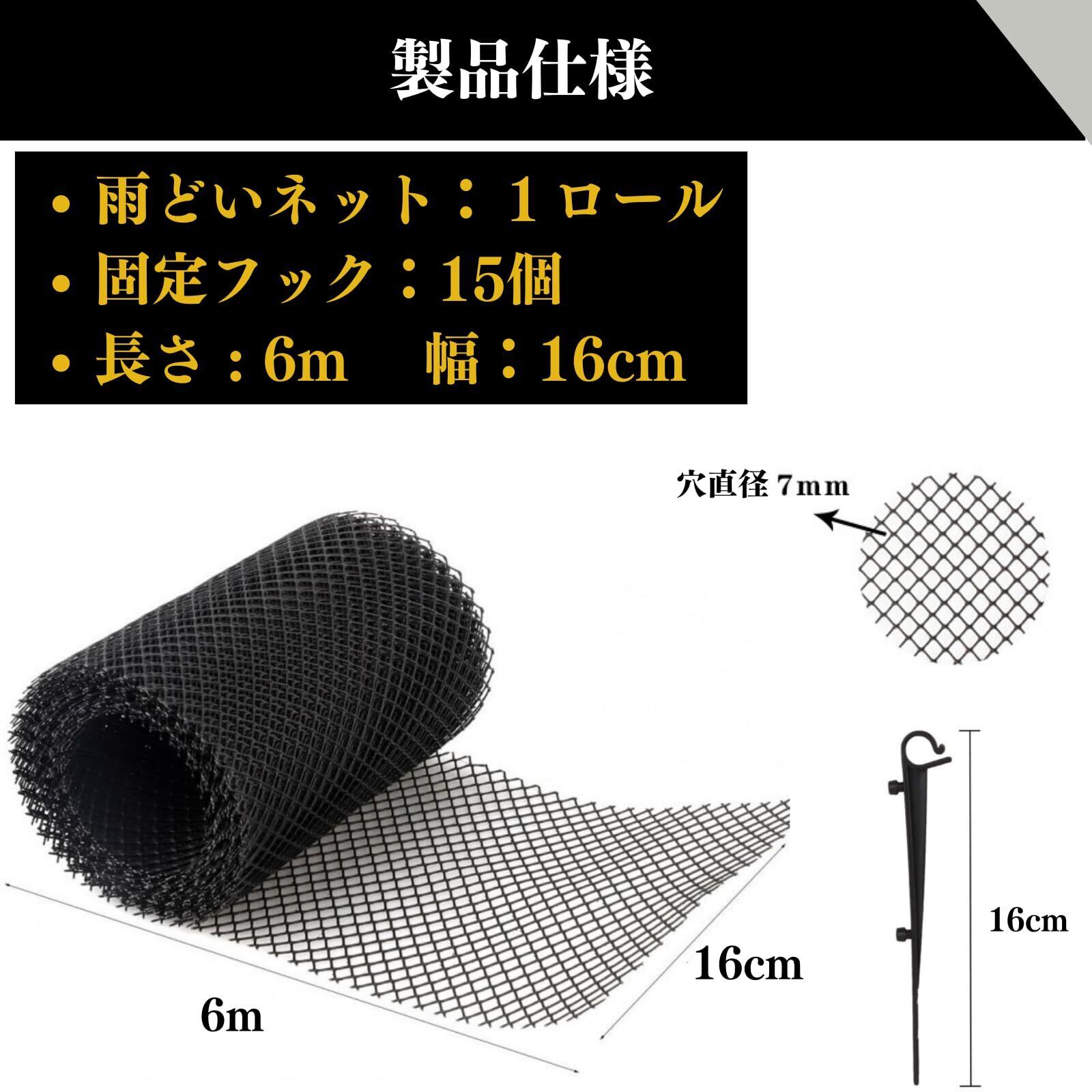 【セット内容】雨どいネット:1ロール 固定フック:15個 ●長さ : 6m 幅:16cm ●カラー:黒