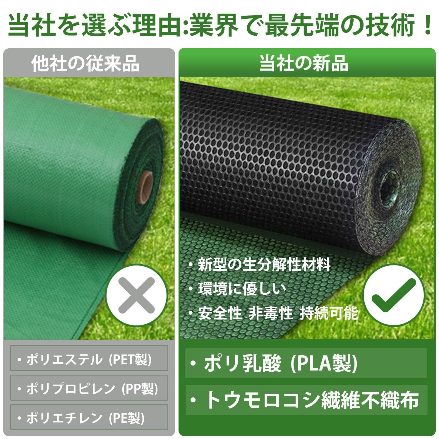 3【130g/㎡高密度・12年高耐久・高遮光】高密度&高耐久型のプロ仕様!130g/㎡高密度不織布の厚手な材質で、一般的な薄手の防草シートより引き裂き強度が高く、切り込みを入れても裂けやほつれが発生しにくい特徴があり、破れにくく丈夫です。秤量も大きい分、耐久性も抜群!太くてトウモロコシ長繊維で融着しているので、密度が非常に高いです。UV剤入り、日光を遮り雑草が生えにくいです。遮光率最大99.9%なので光を遮ることで光合成を防ぎ、化学除草剤を使用せず、生分解性があり、使用後の自然分解が可能。環境保護にも貢献します。