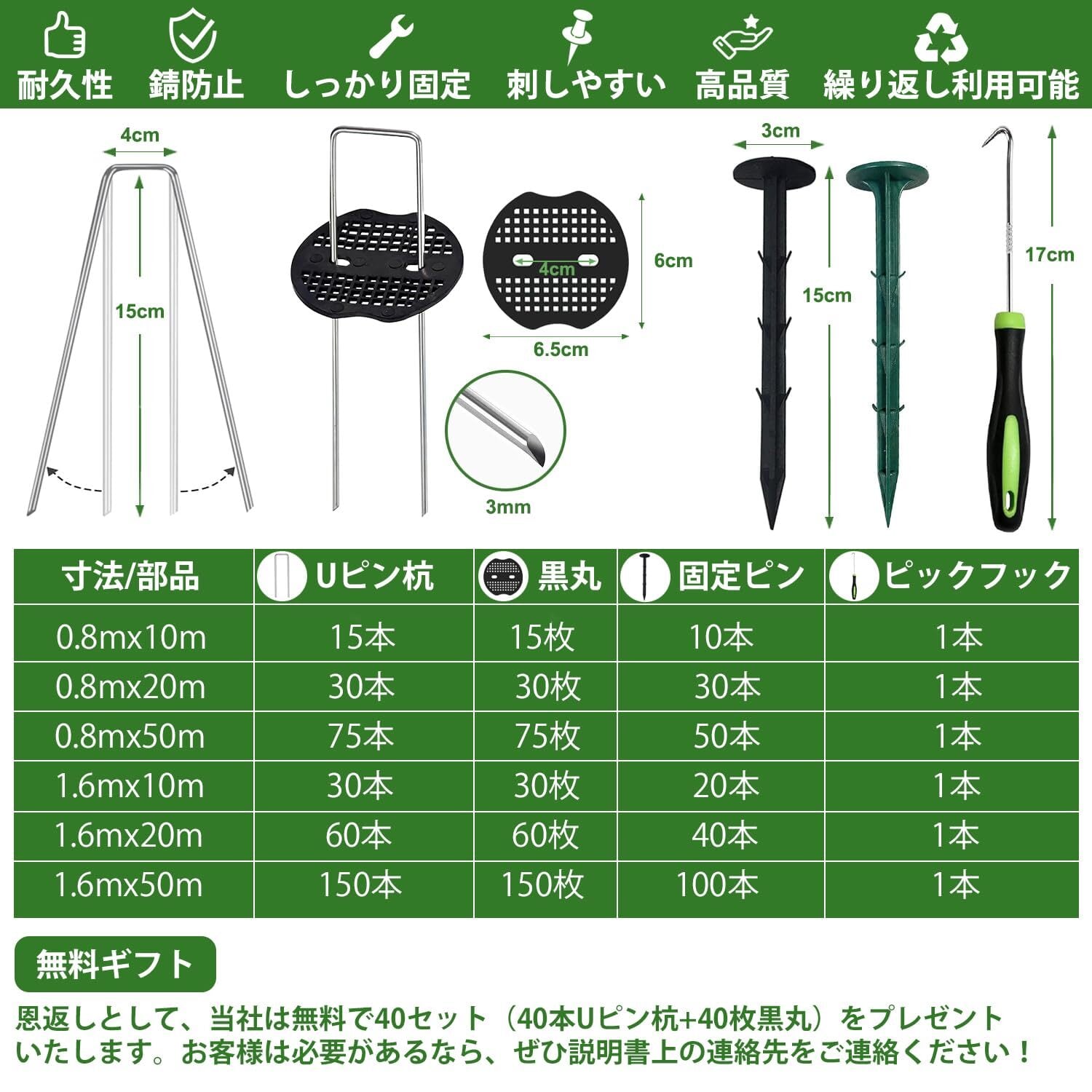 5【製品仕様・ご注意】サイズ:0.8*10m/パッケージ内容:防草シート*1、スチール製Uピン杭*15、黒丸*15、固定ピン*10、ピックフック*1、日本語説明書*1。ご注意:初めてご使用時に、防草シートを地面に設置した後、水やりホースなどで完全に水を撒いて濡らしてください。防草シートを水に浸した後、3-5日放置して、透水効果はより良くなります。
