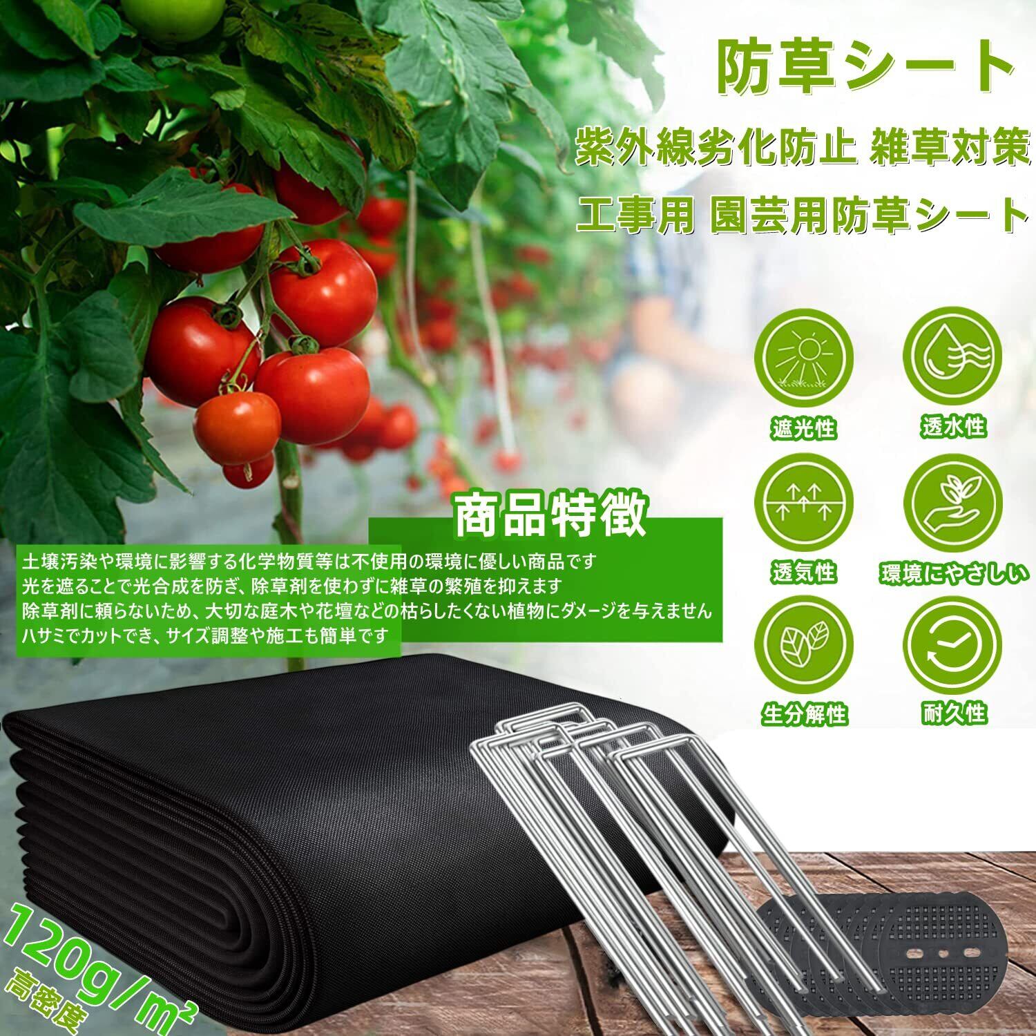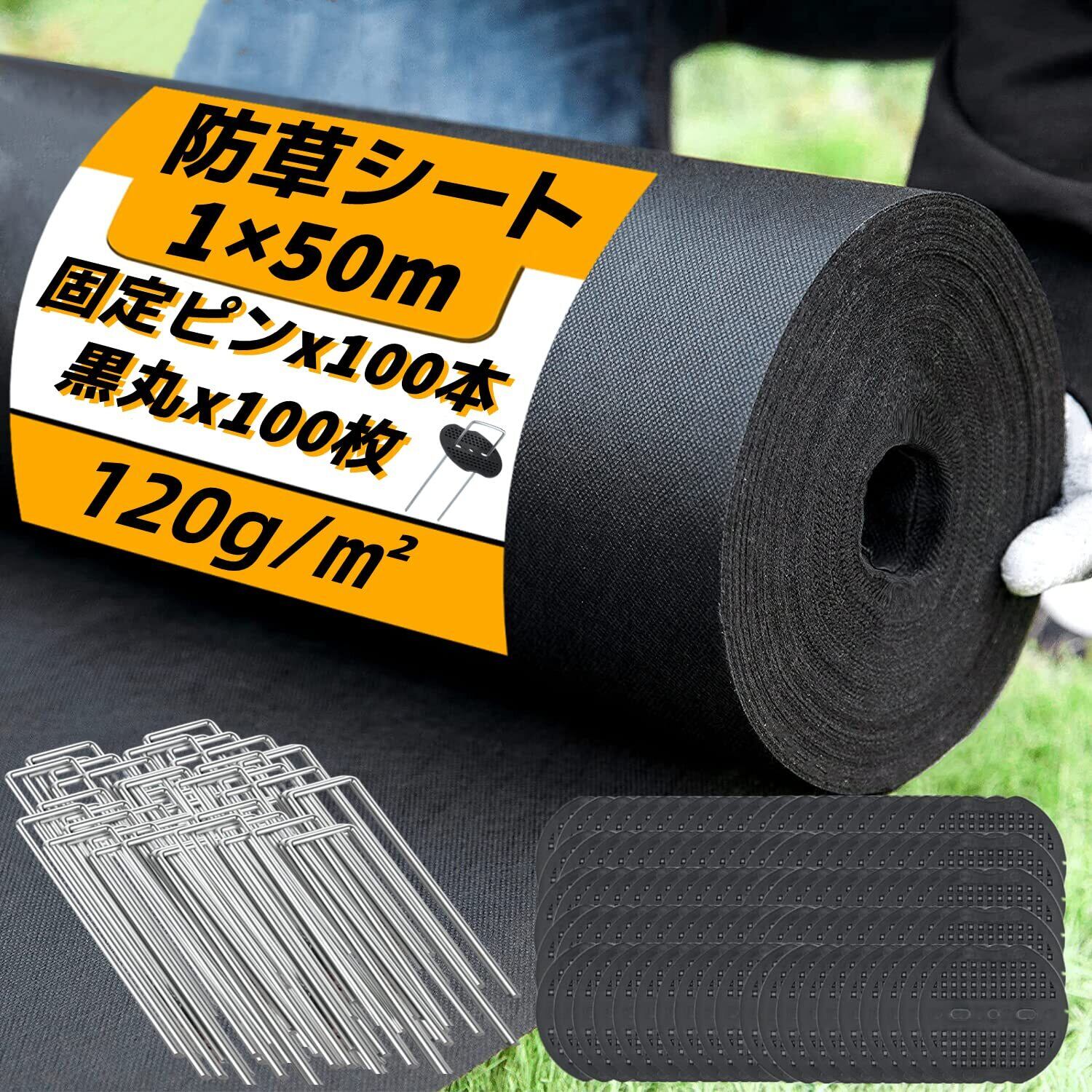 防草シート 除草シート 適格請求書発行可 防そうシート 防草シート 不織布 防草 シート 雑草防止シート 1×50m 不織布 固定ピン100本と黒丸100枚付き 厚手 高透水性 UV耐候剤配合 親水剤入 高耐久 高密度120g/㎡(1×50m, ブラック)