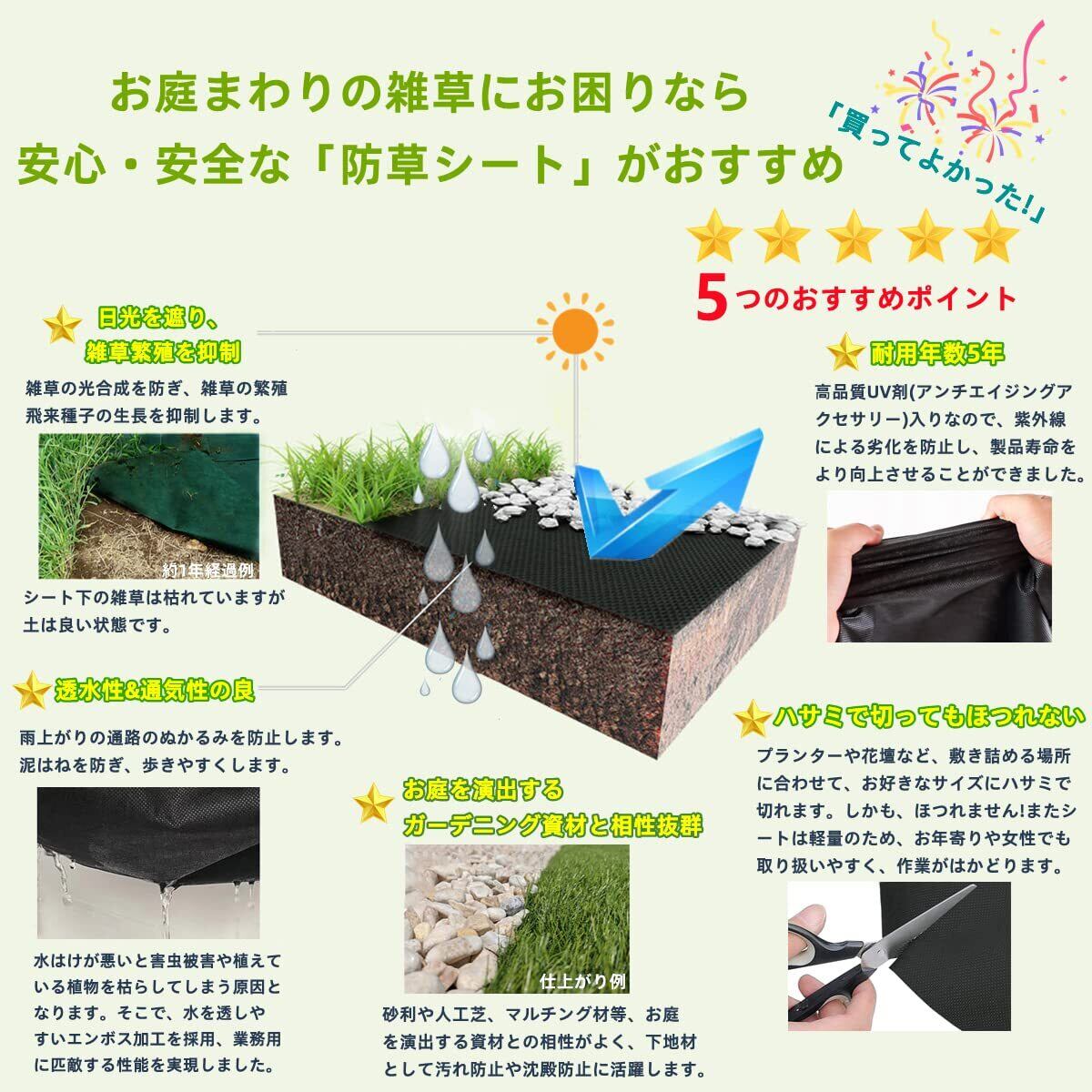 【防草シートのパッケージ詳細】 防草シートの材質:高密度不織布/両面使用可 防草シートのサイズ:1x50m(巻き物) 防草シートのセット内容:スチール製Uピン杭100本+黒丸100枚の合計200点セット(スチール製ピン杭の表面には亜鉛メッキ加工がされているため腐食や錆びが起こりにくいです。)【防草シートの適用場所】路肩、畑、菜園、果樹園、花壇、空き地、建物まわり(庭、通路、物干し場、ウッドデッキ下、人工芝下、砕石・砂利下、ガレージ、墓地(墓石まわり)などでご利用できます。