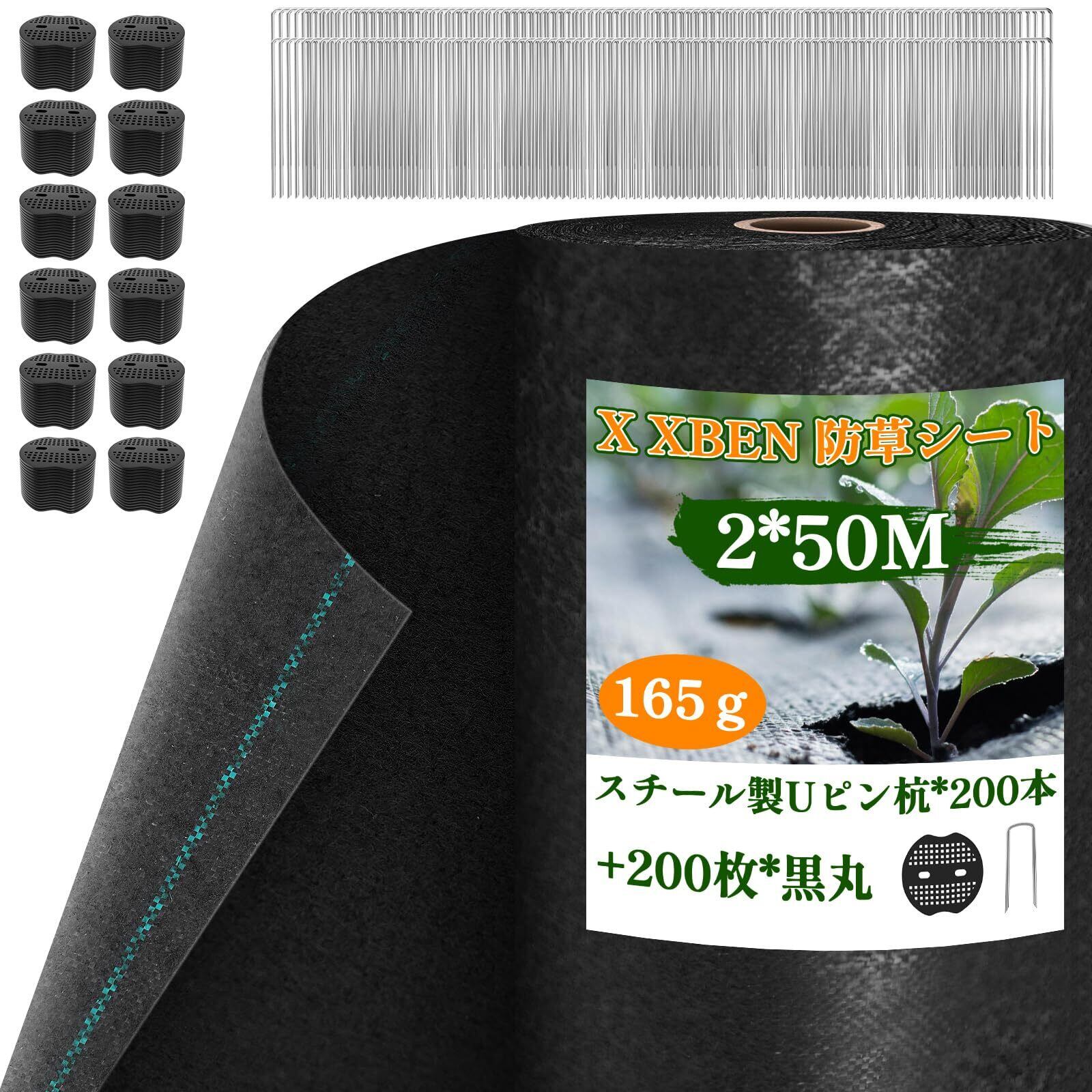 X XBEN 165g 防草シート2x50M 改良新型素材 固定Uピン杭200本と黒丸200枚付き 耐用年数5-7年 高耐用性アップ 草よけシート 雑草防止 雑草対策除草シート 高密度 高透水 ぼうそうシート 適格請求書発行可 | KSショップ