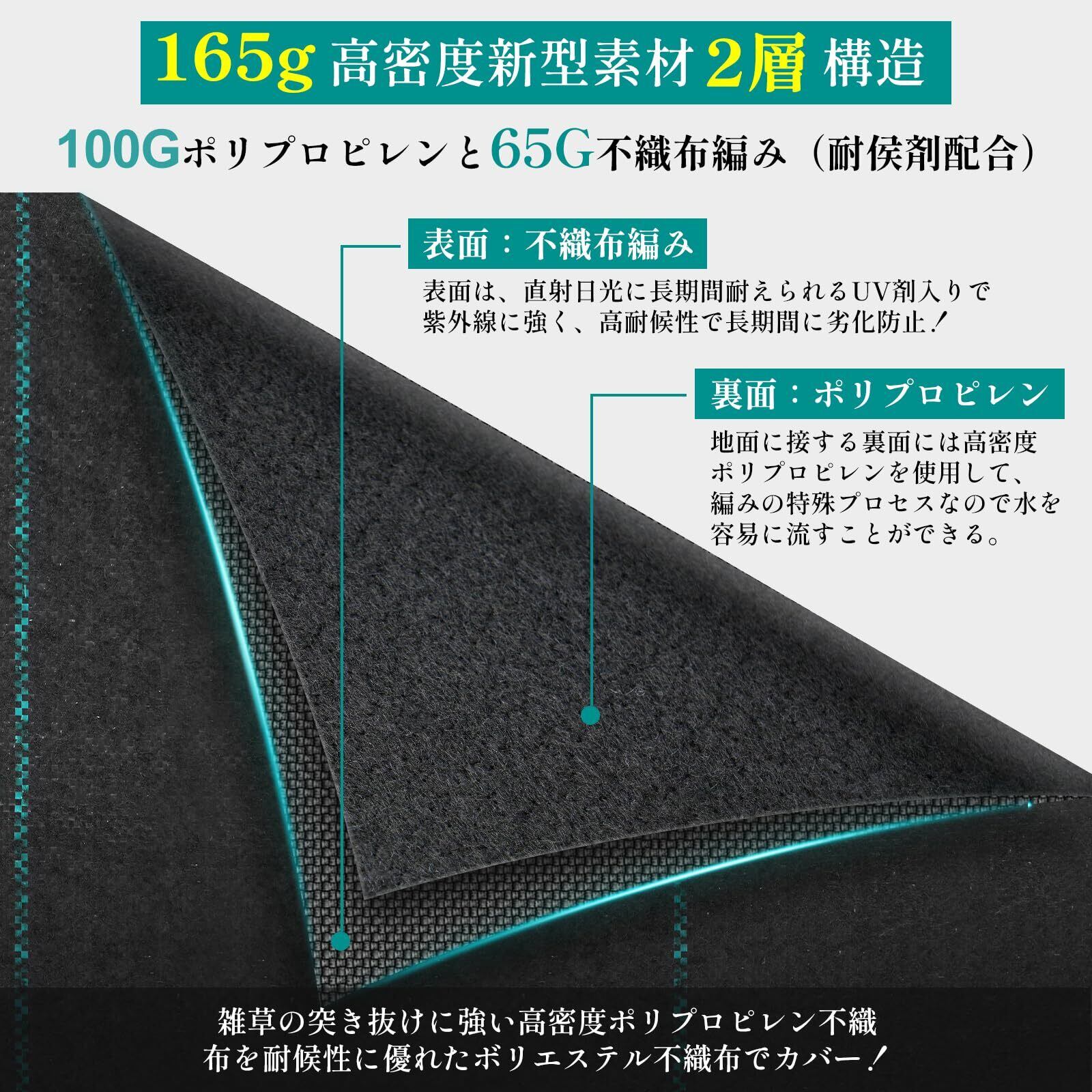 【165g高耐久性素材】の防草シートは100Gポリプロピレン+65G不織布編み(耐侯剤配合)という165G新型素材を採用されて、市販の100g、130g材料より耐久性に優れて破れや裂けに強い丈夫な作りです。緊密に編まれたポリプロピレン織物針から作られ、生地にはUVカット加工を施しており、紫外線による破れ等の劣化を防止します。製品の使用寿命をより向上させて、使用環境などによって、耐用年数は約5-7年にできます。