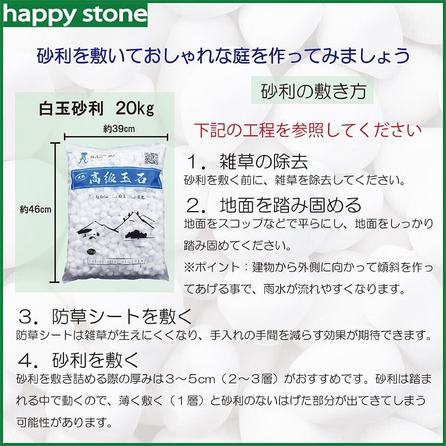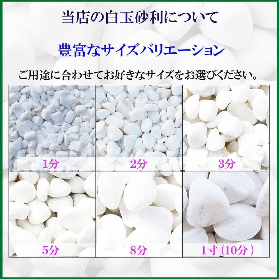 茨城県ひたちなかの玉砂利・石材問屋よりの出品です 国産・中国・フィリピン産の石を扱っている会社です、庭園・寺・墓所・ブロックの原料など幅広く納品させていただいております。 産地:中国太行山脈 当社の白玉砂利は純白さに近く、自然玉にも近い丸みを帯びています。 鉢植に庭に水槽にいろんな演出が出来ます。。洒落が効く庭園に白玉で落ち着いた雰囲気の砂利です。石ならではのゴツゴツとした感じや、自然になじむ落ち着いた色合いが特徴です。 自然の風合いを生かした天然石だからこそ出せる、優しさとぬくもりをお届けします。 庭等に敷かれる場合は、1平米あたり60Kgを目安としてください。 コンクリート等の硬い場所に敷かれる場合は、砂利が転がって転倒の恐れがありますので1平米あたり80~100Kgを使われることをお奨めします。天然石の為形が様々で最小直径が表示サイズとなっているため、大きさにばらつきがあります。