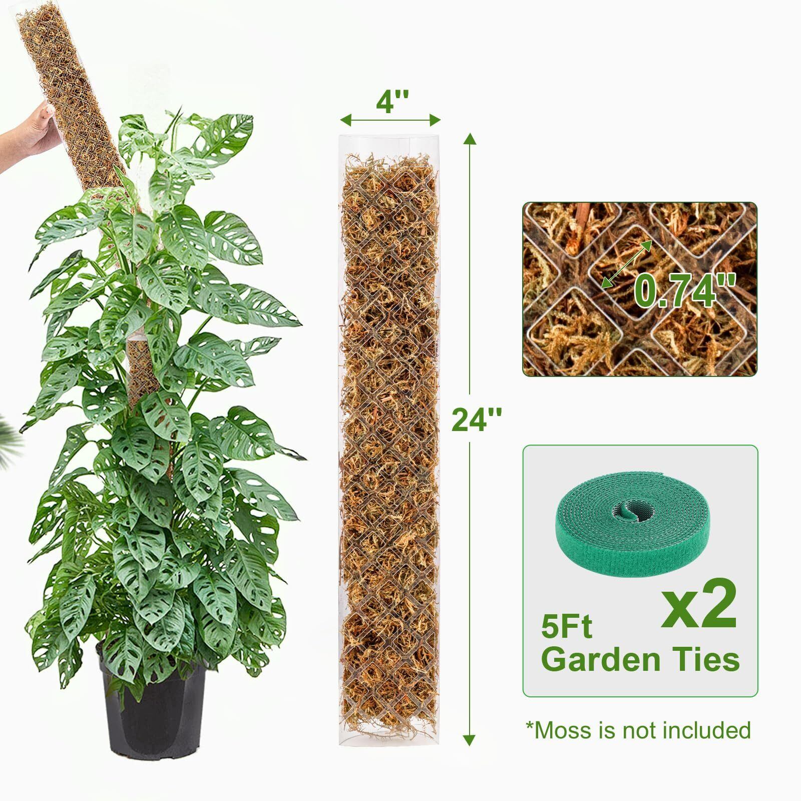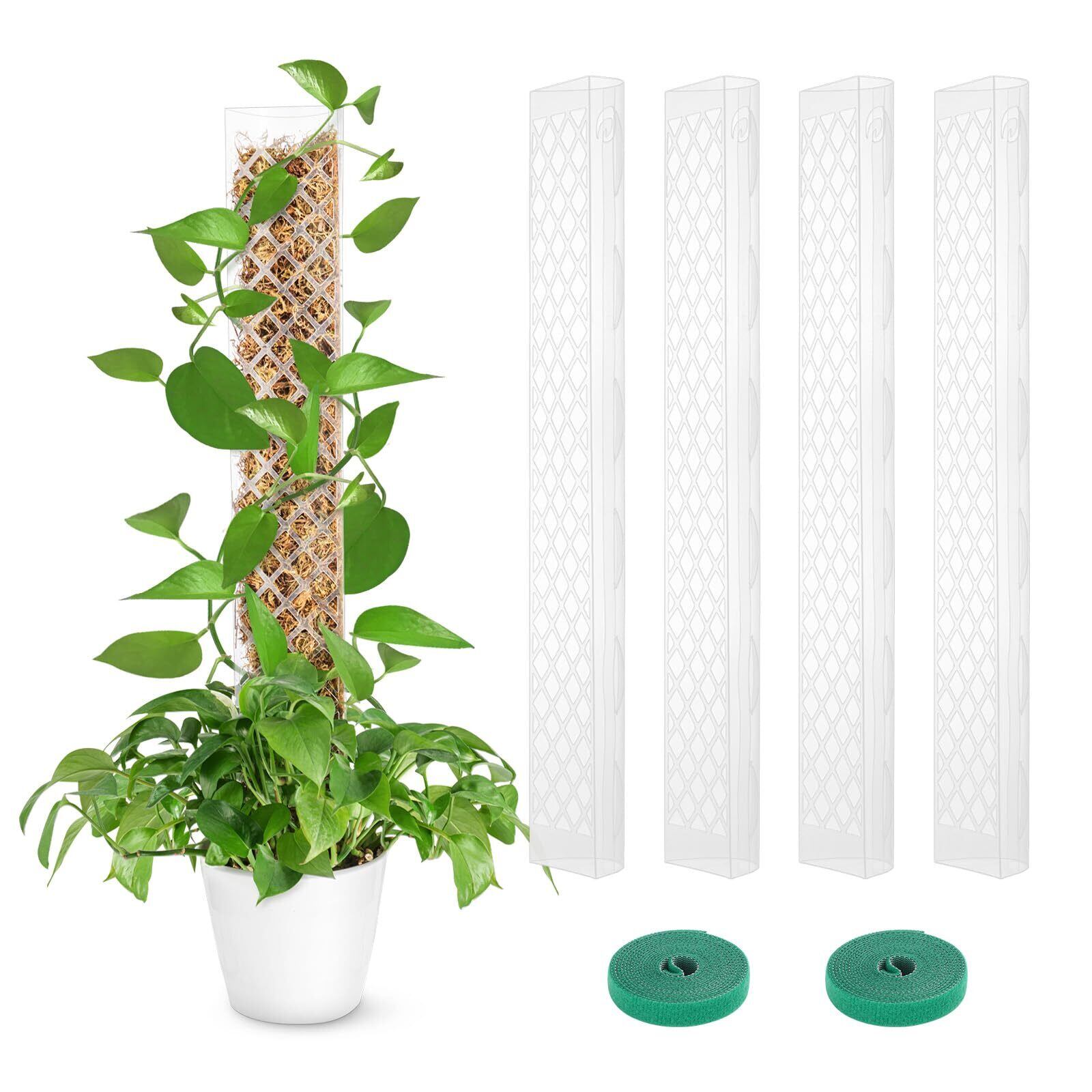 GROWNEER 4パック 24インチ プラスチックモスポール モンステラ 積み重ね可能 屋内登山用植物サポート 透明な植物ポール 10フィートのガーデンタイ付き ミズゴケに対応