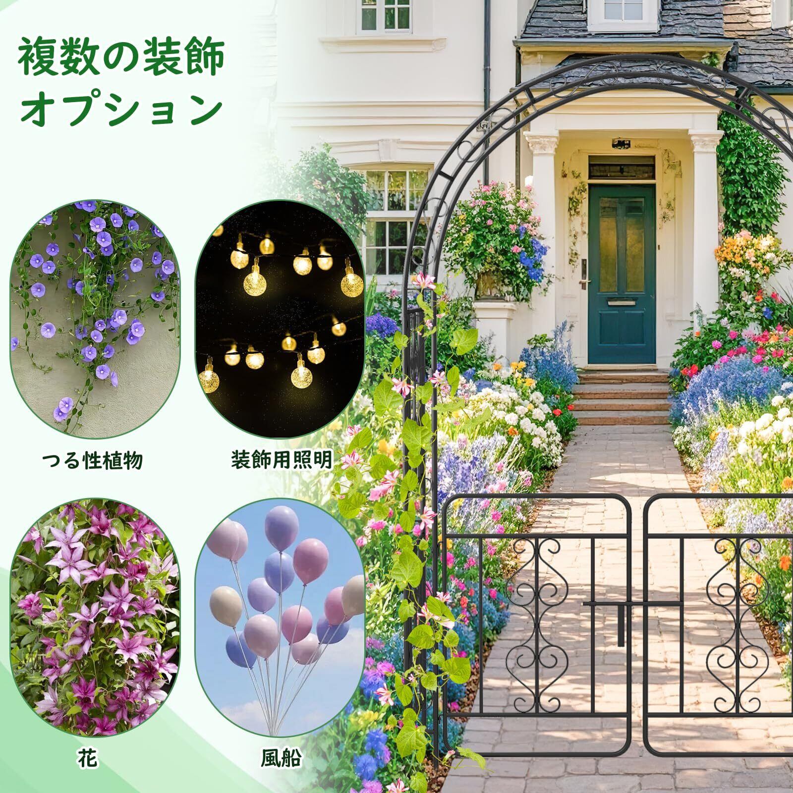 [魅力的な入り口]: バラアーチには、精巧な扉が備わっており、堅固に施錠可能です。これにより、静かな庭園に魅惑的な入口を演出します。