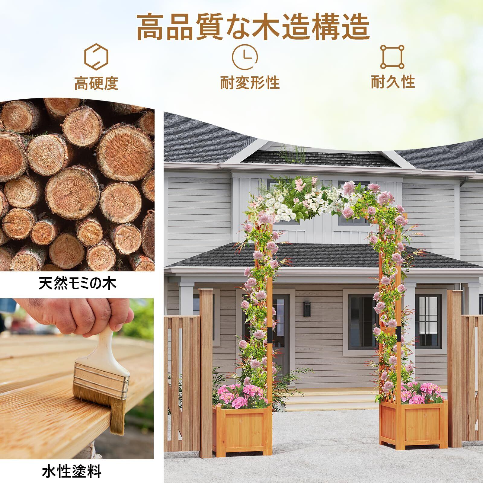 【安心の構造】この木製アーチは天然モミ材に耐水塗装を施し、金属ジョイントで補強。雨風にも負けず、ガーデンアーチとして長年使えます。天然木ならではの風合いはそのままに、変形しにくい設計です。