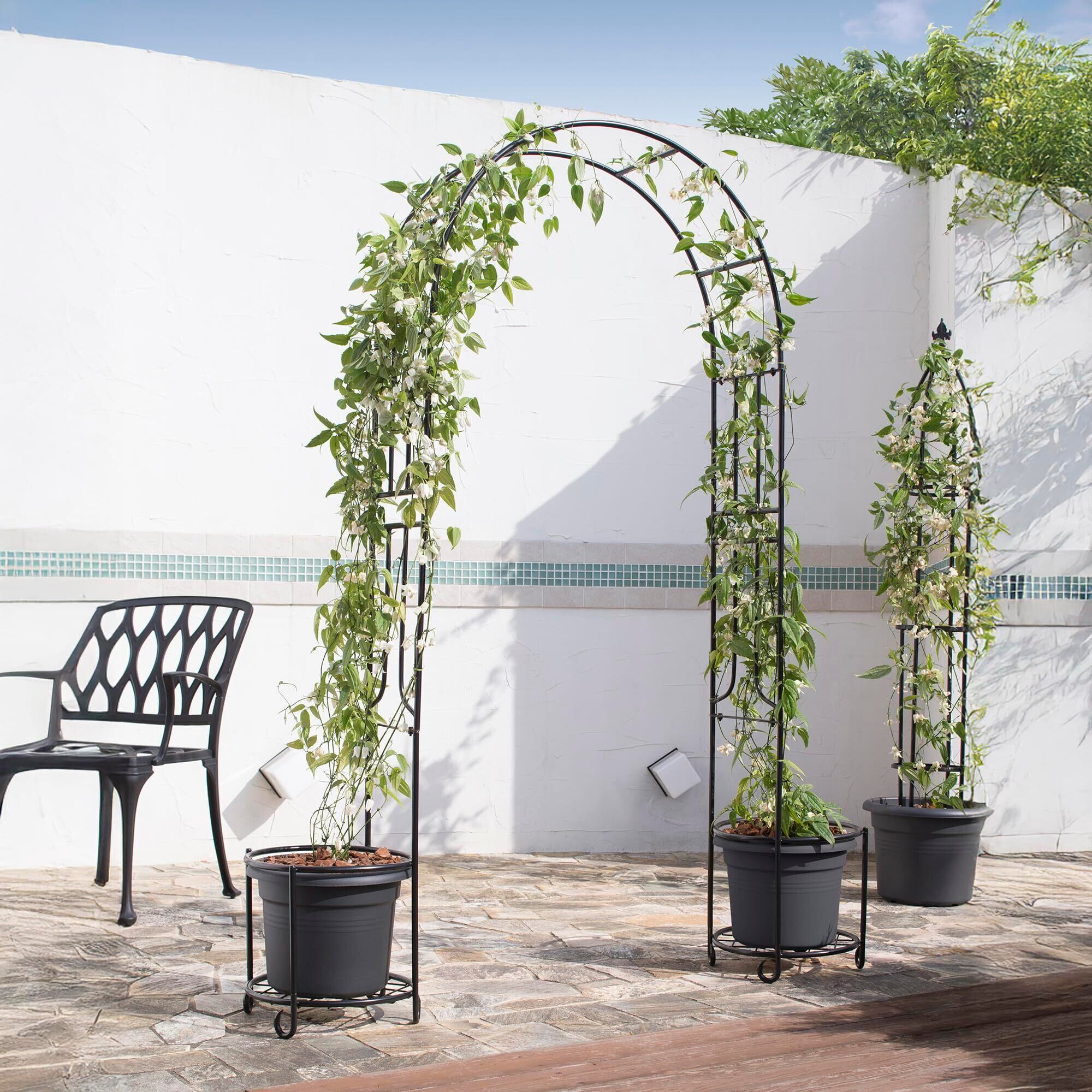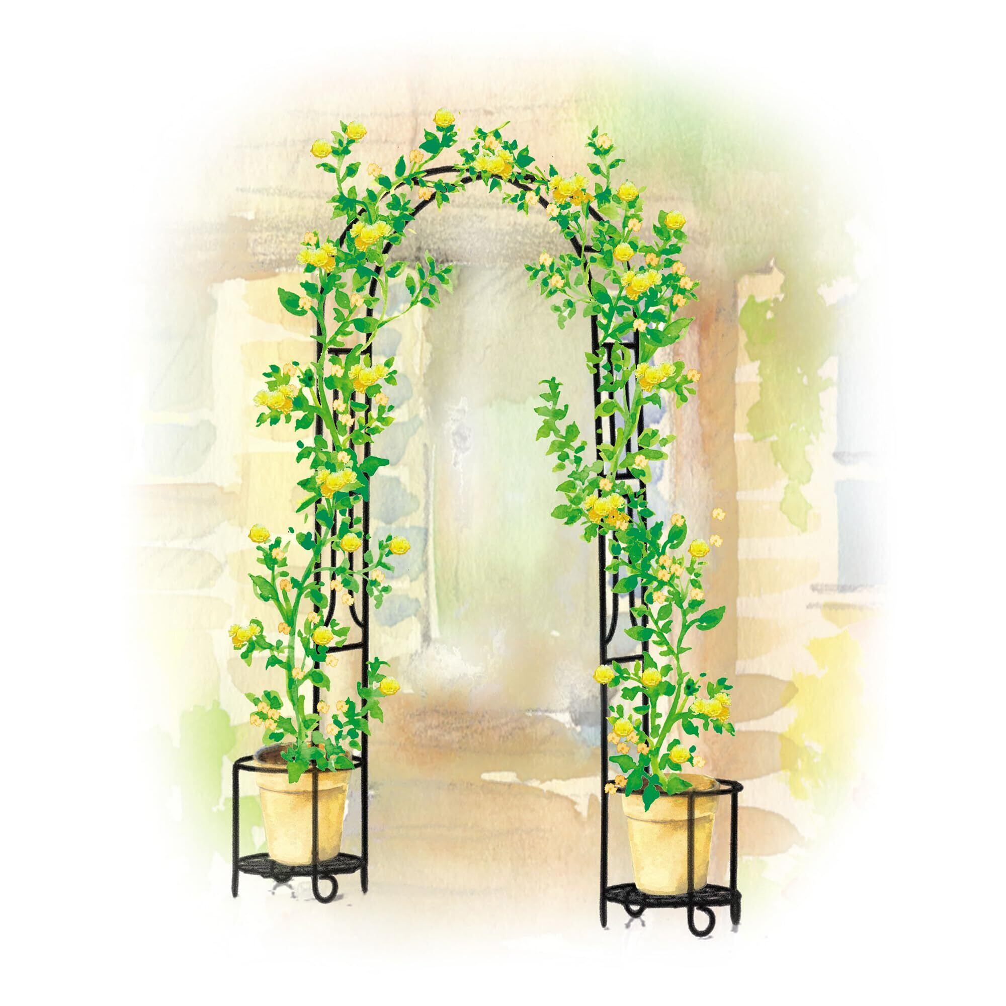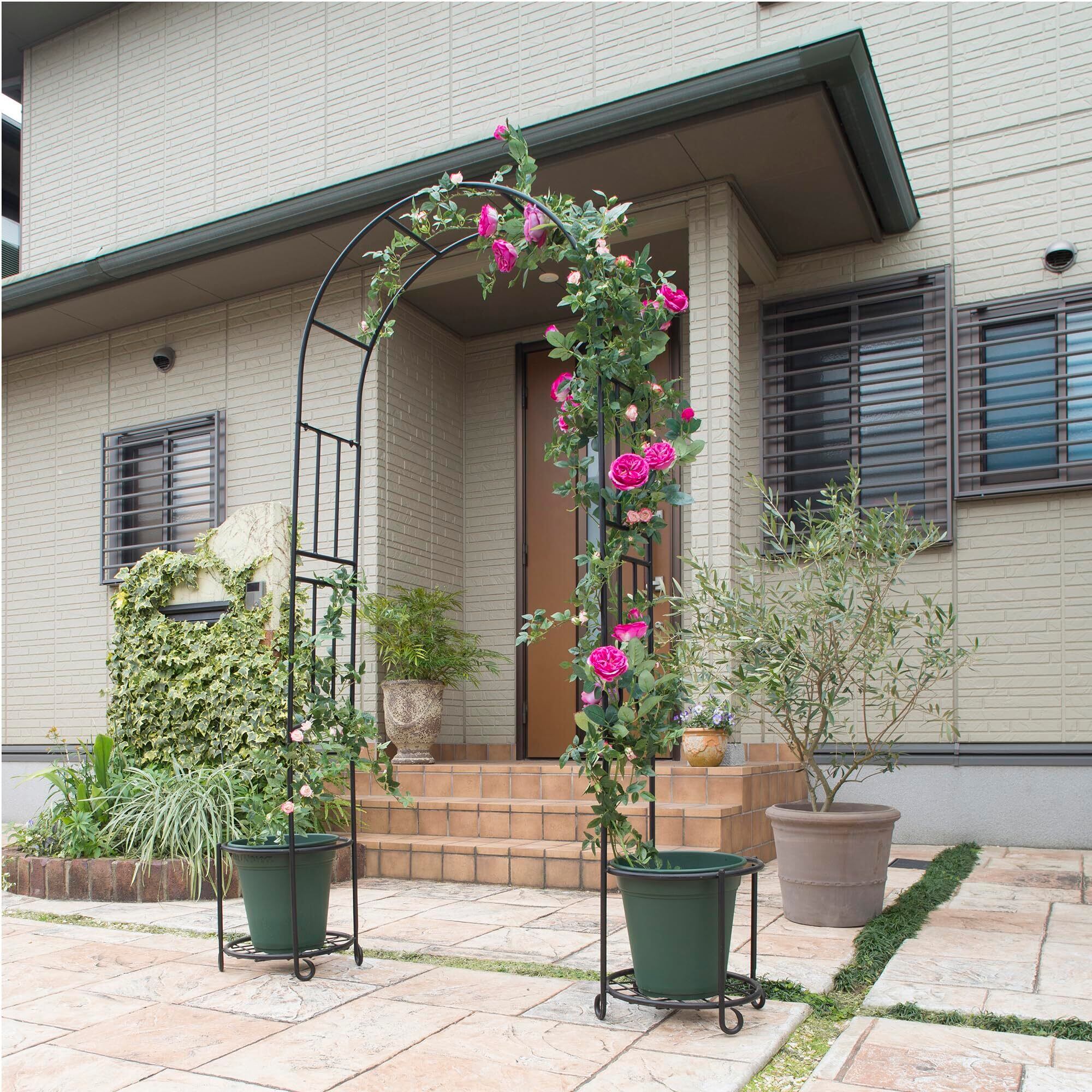 鉢植えで育てたバラをそのままアーチに絡めることができます。直植えできないベランダなどでも憧れのアーチがつくれます。
