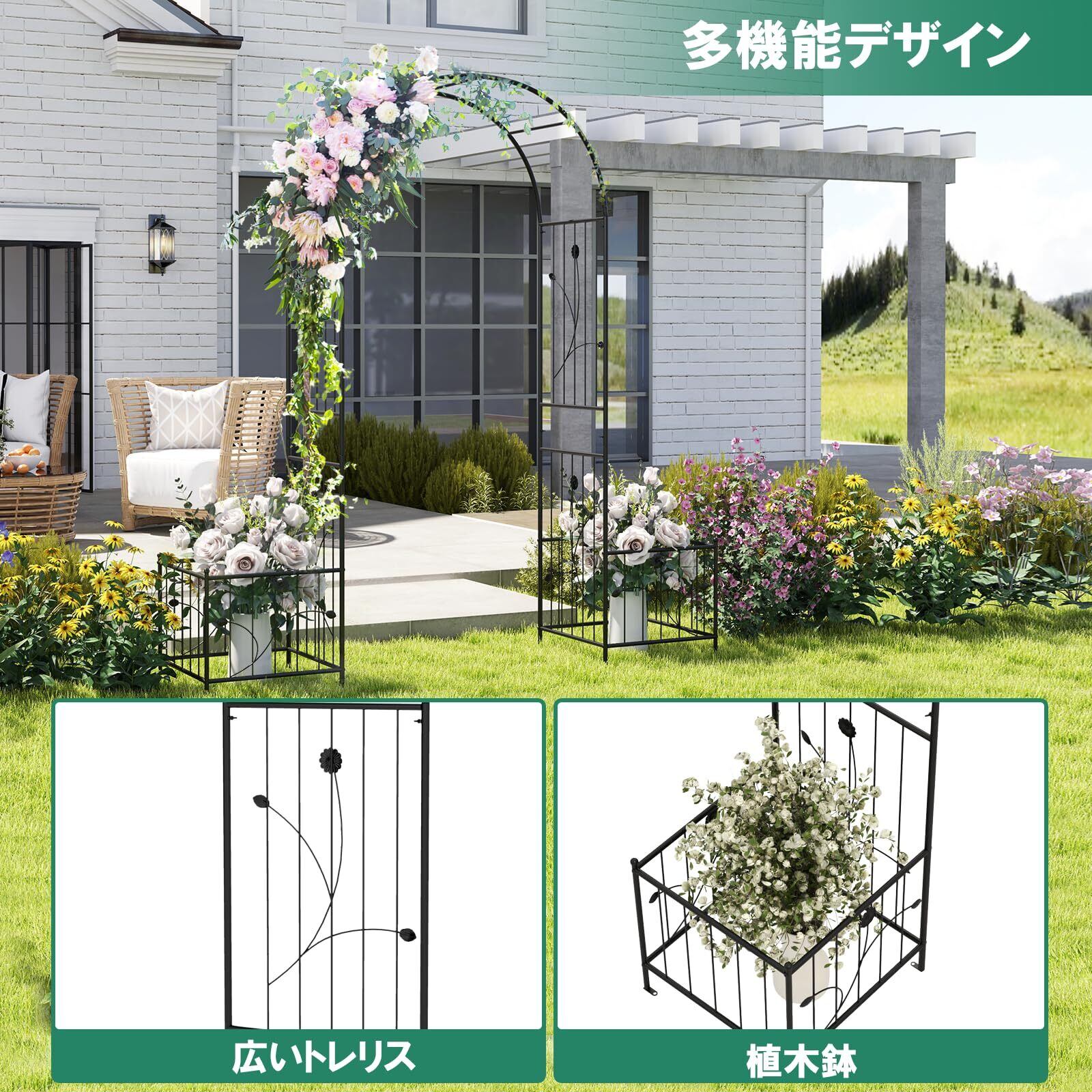 【鉢置き台付き】独特な設計で、中央にガーデンアーチが設けられており、人々が通り抜けやすい構造となっています。両側にはオープンエンドのプランターが付いており、つる性植物や装飾に適しています。装飾的なアーチだけでなく、実用的でもあるプランターです。
