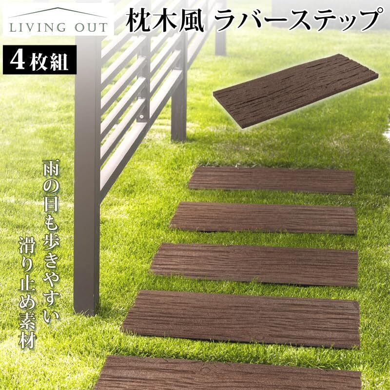 リビングアウト(Living Out) 枕木風ラバーステップ ブラウン 幅25.5x奥行61x高さ1.7cm 4枚組 ステップ 枕木風 廃タイヤ材を用いたリサイクルラバー SDGs アプローチ 滑り止め エクステリア 玄関用品 おしゃれ