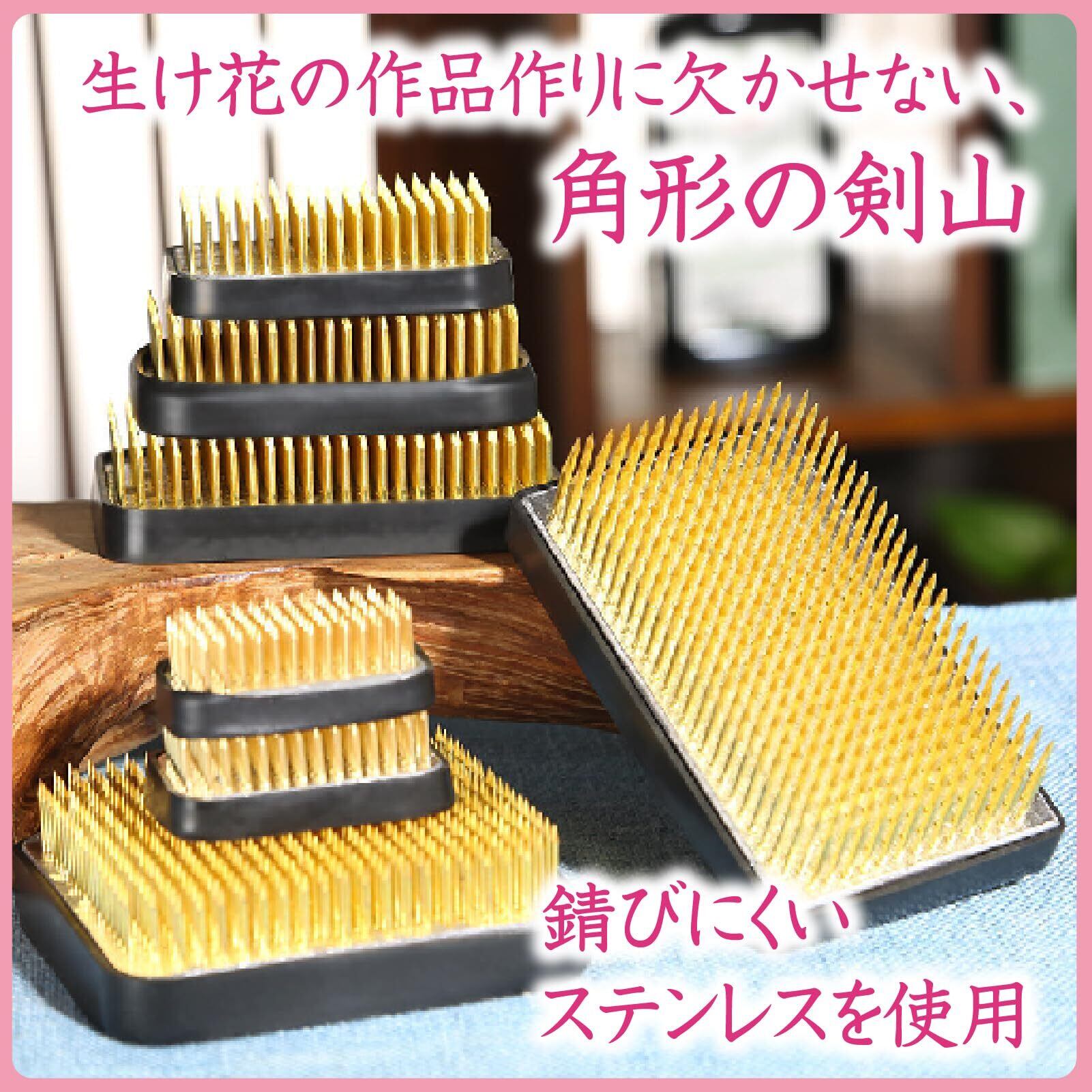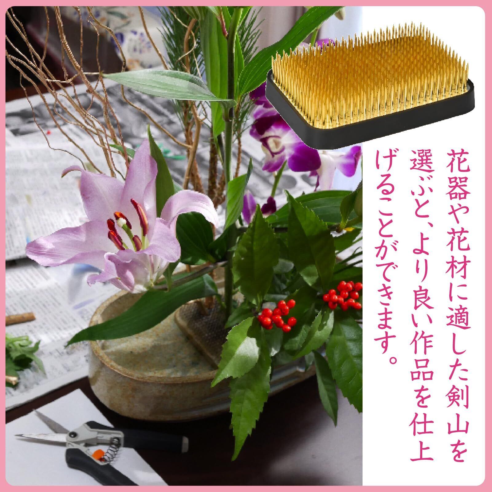 生け花の作品作りに欠かせない、角形の剣山です。金属製、底にゴムリング付き。花器を傷つけることなく、安定感もあり。フラワーアレンジメントにもぜひご利用ください。