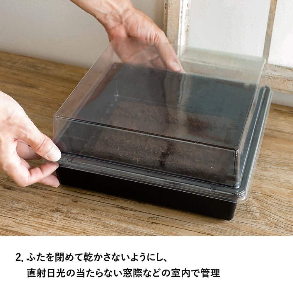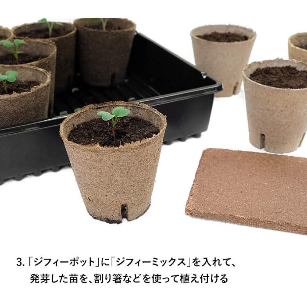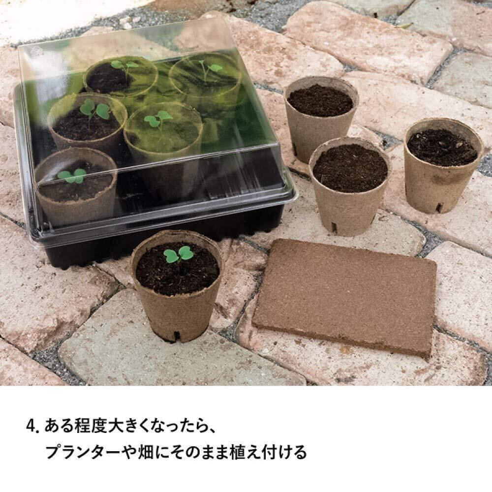 【使用方法】場所も取らないので清潔な室内でも苗づくりができる栽培キットです。育苗トレー(育苗箱)にピートバンを置き、水を注いで膨らませます。種をまいて芽が出たら、霧吹きで湿らせたジフィーポット(育苗ポット)に培養土を入れ、植え替えます。育苗ポットを育苗トレーに並べ、温度が必要な場合はフタをかぶせます。